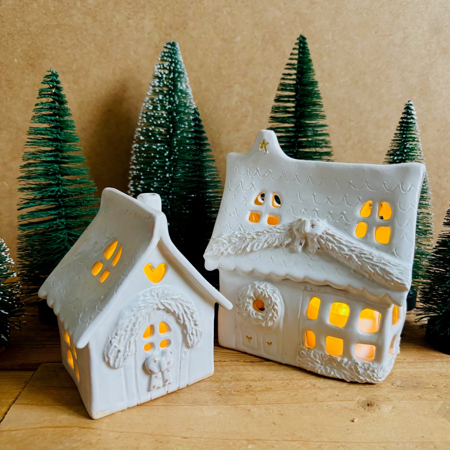 Cette année, les maisons se déclinent en deux formats pour vous permettre de créer de jolies compositions ! Elles sont décorées de couronnes, guirlandes et de noeuds saupoudrées d’or !