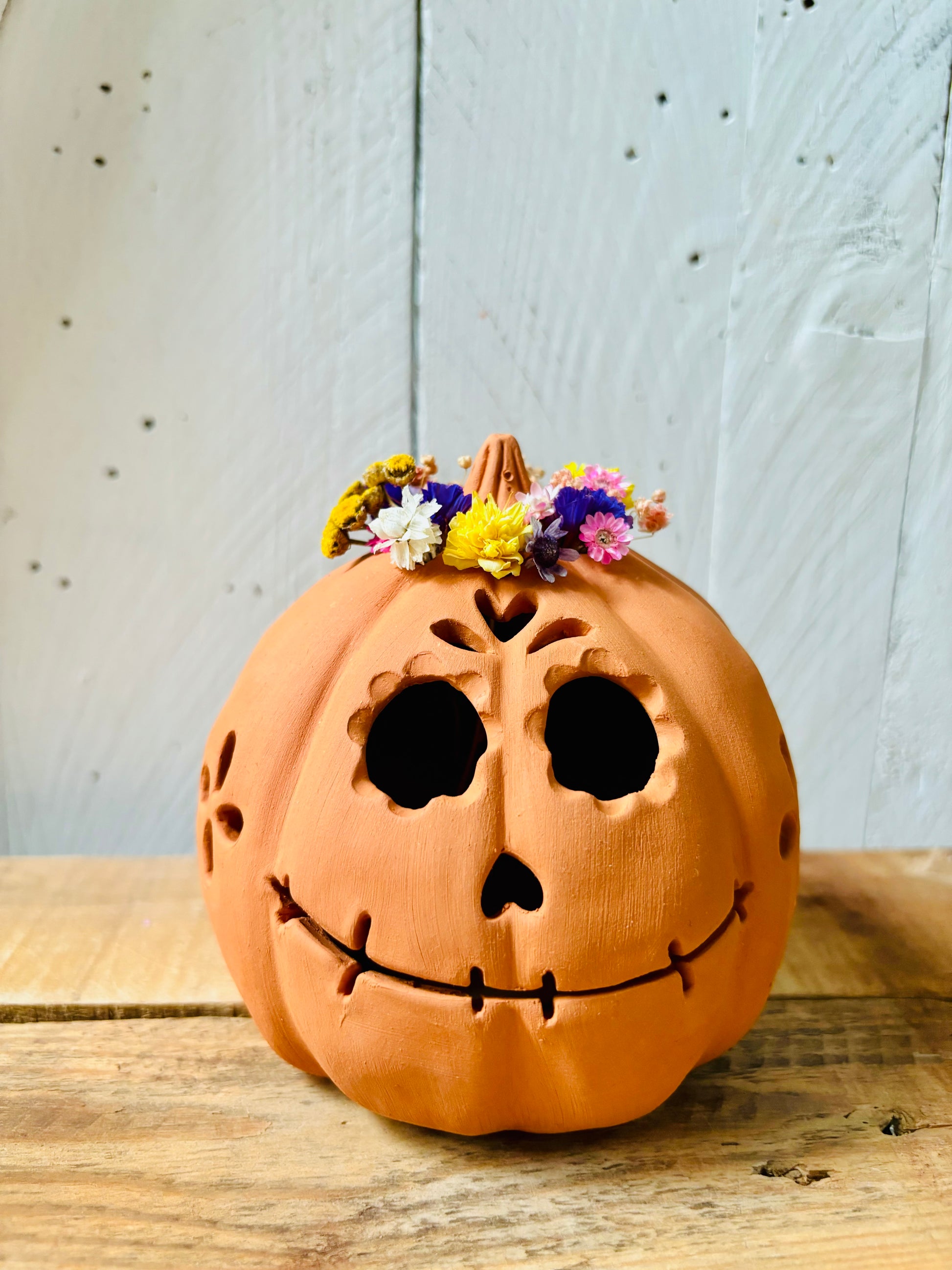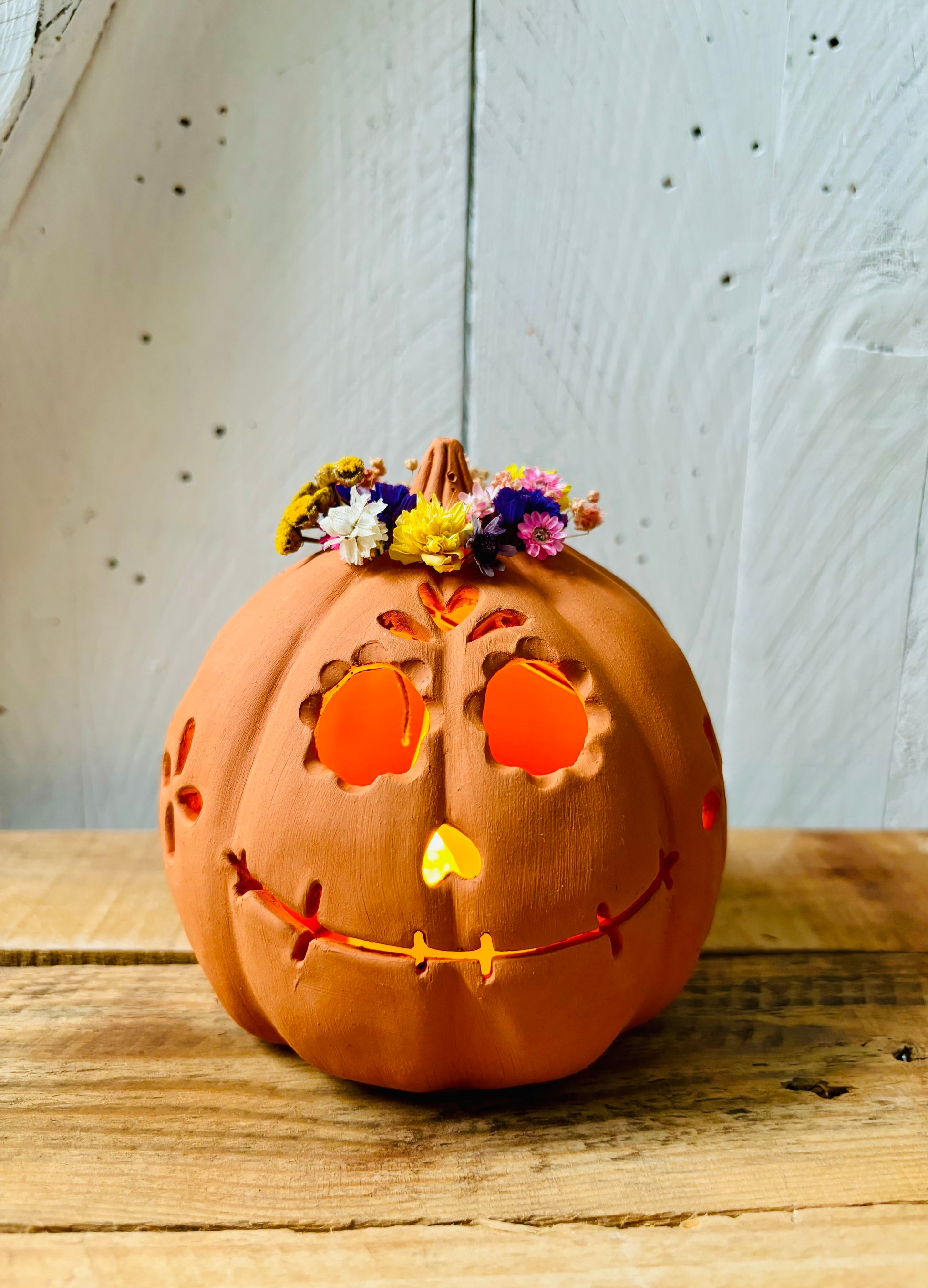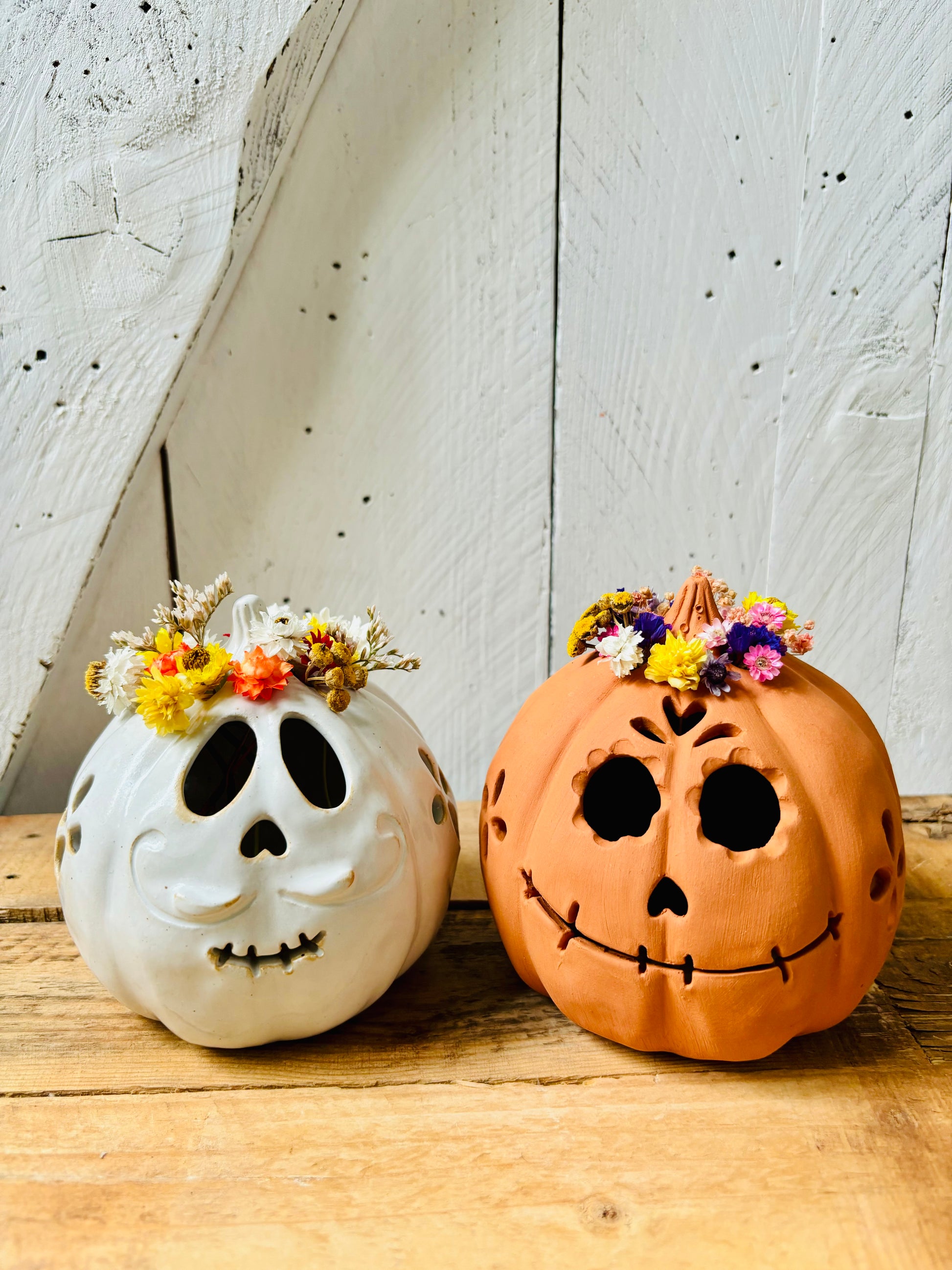 Citrouille photophore en céramique à décorer d'une jolie couronne de fleurs (fleurs non fournies).