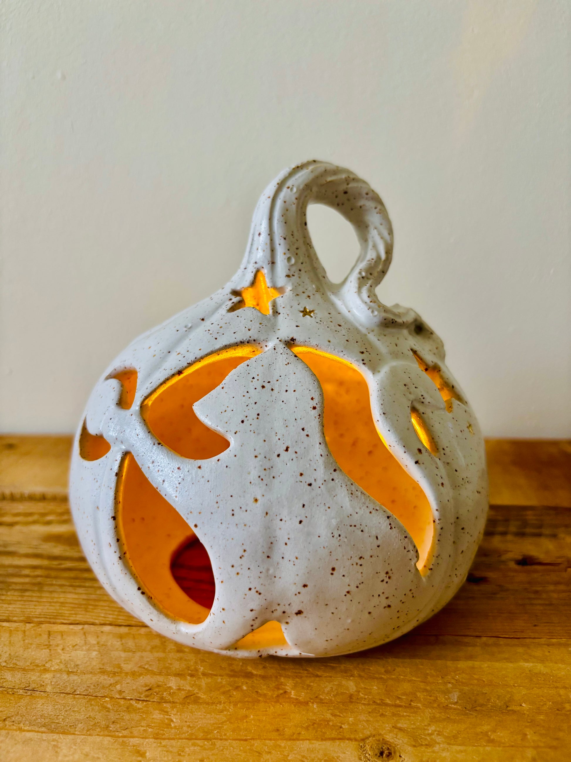 Grand Chat Citrouille - photophore blanc moucheté et or