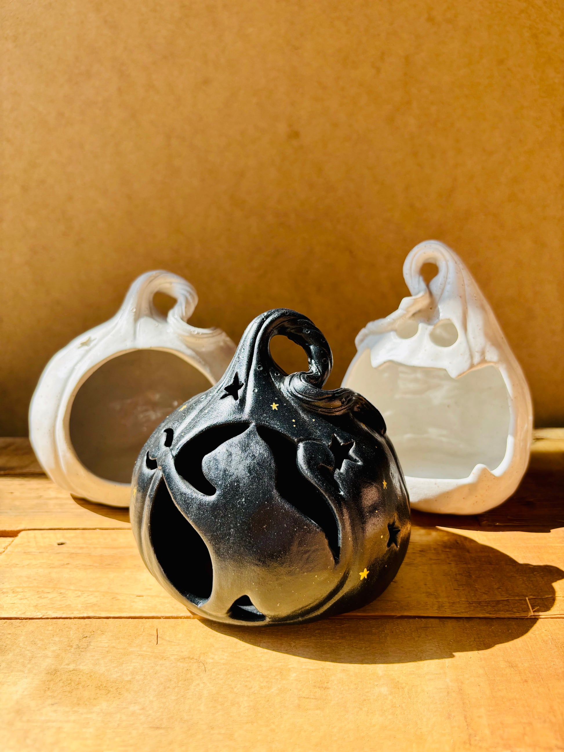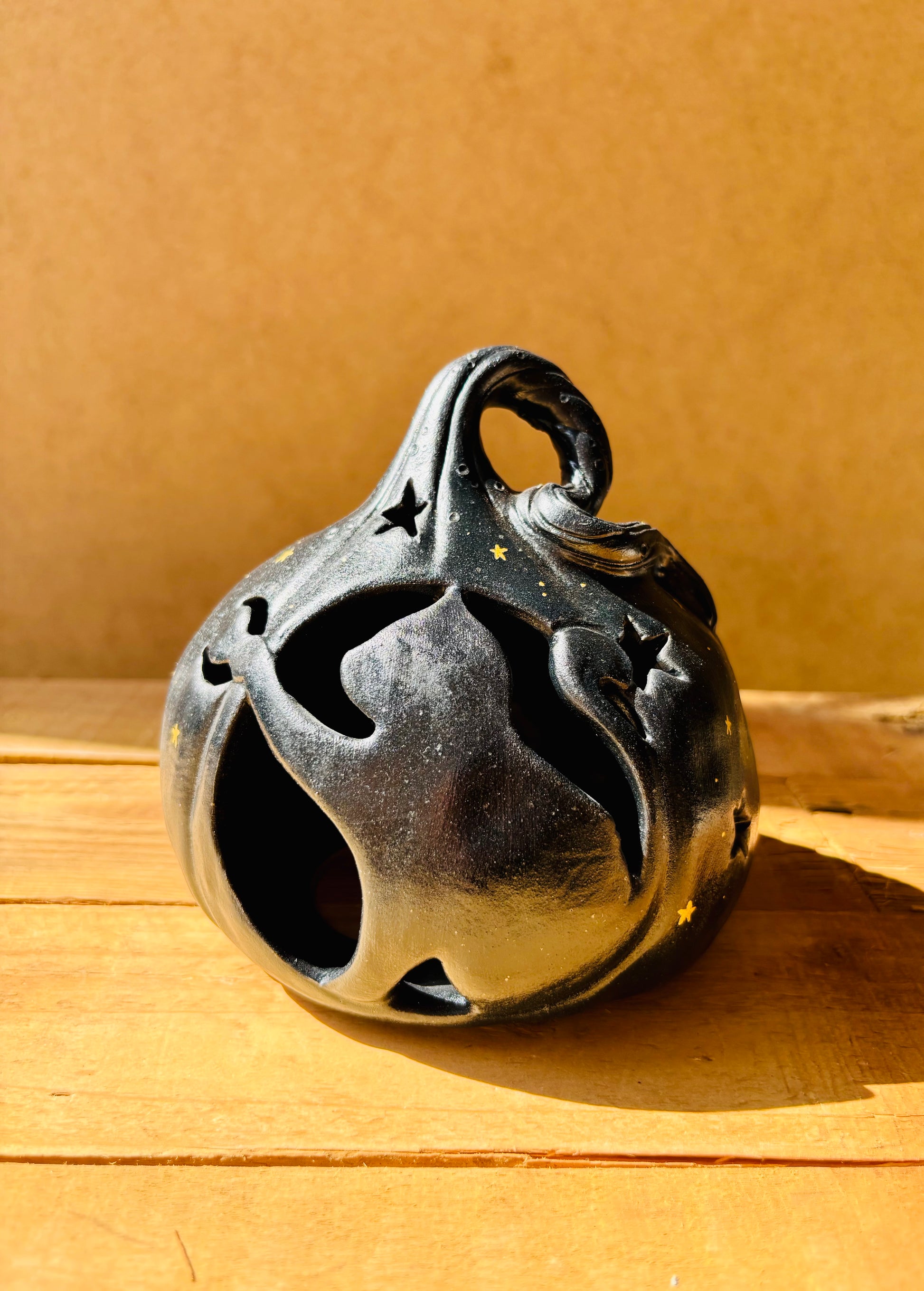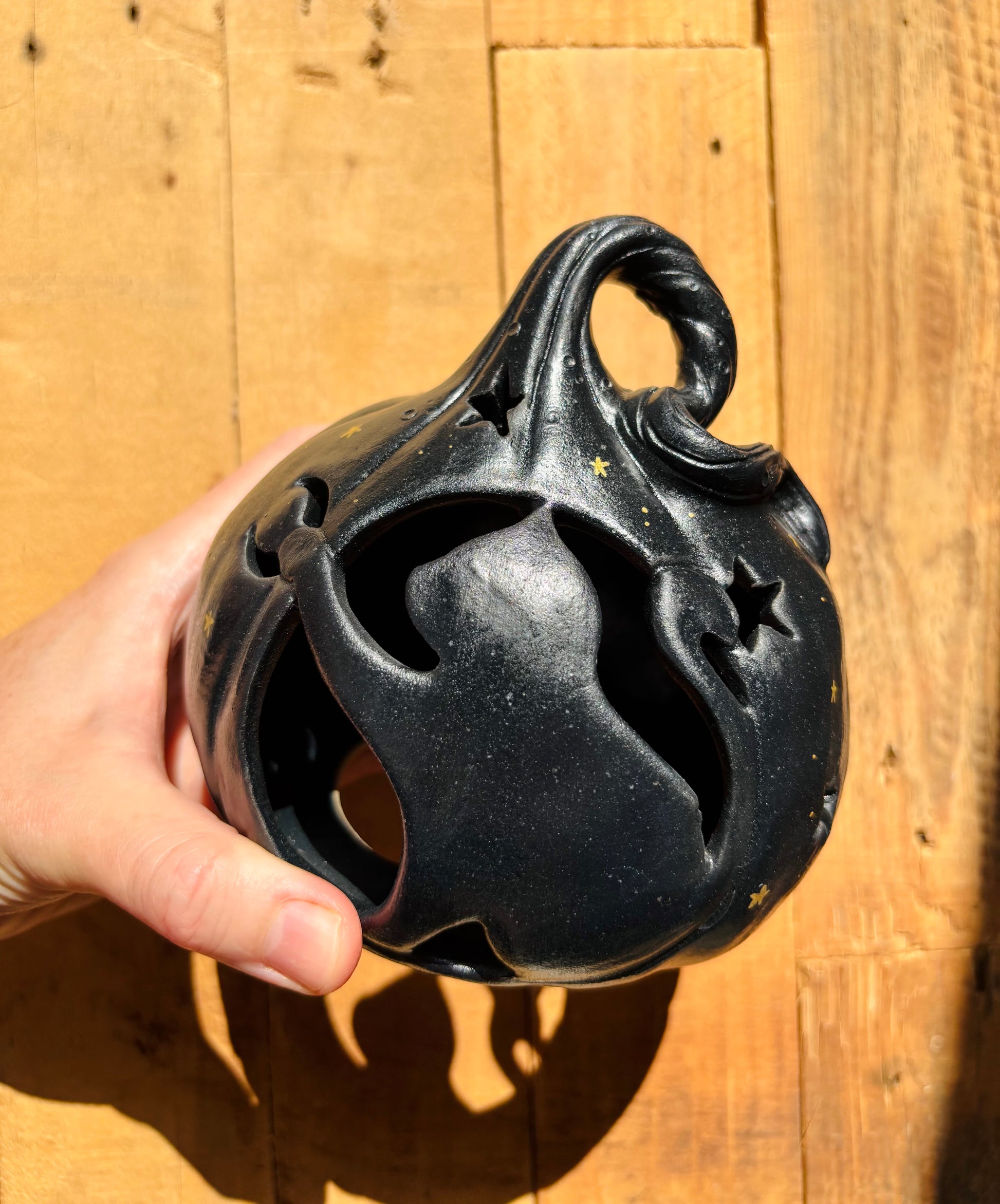 Citrouille photophore en céramique creusée en forme de chat jouant avec une lune.