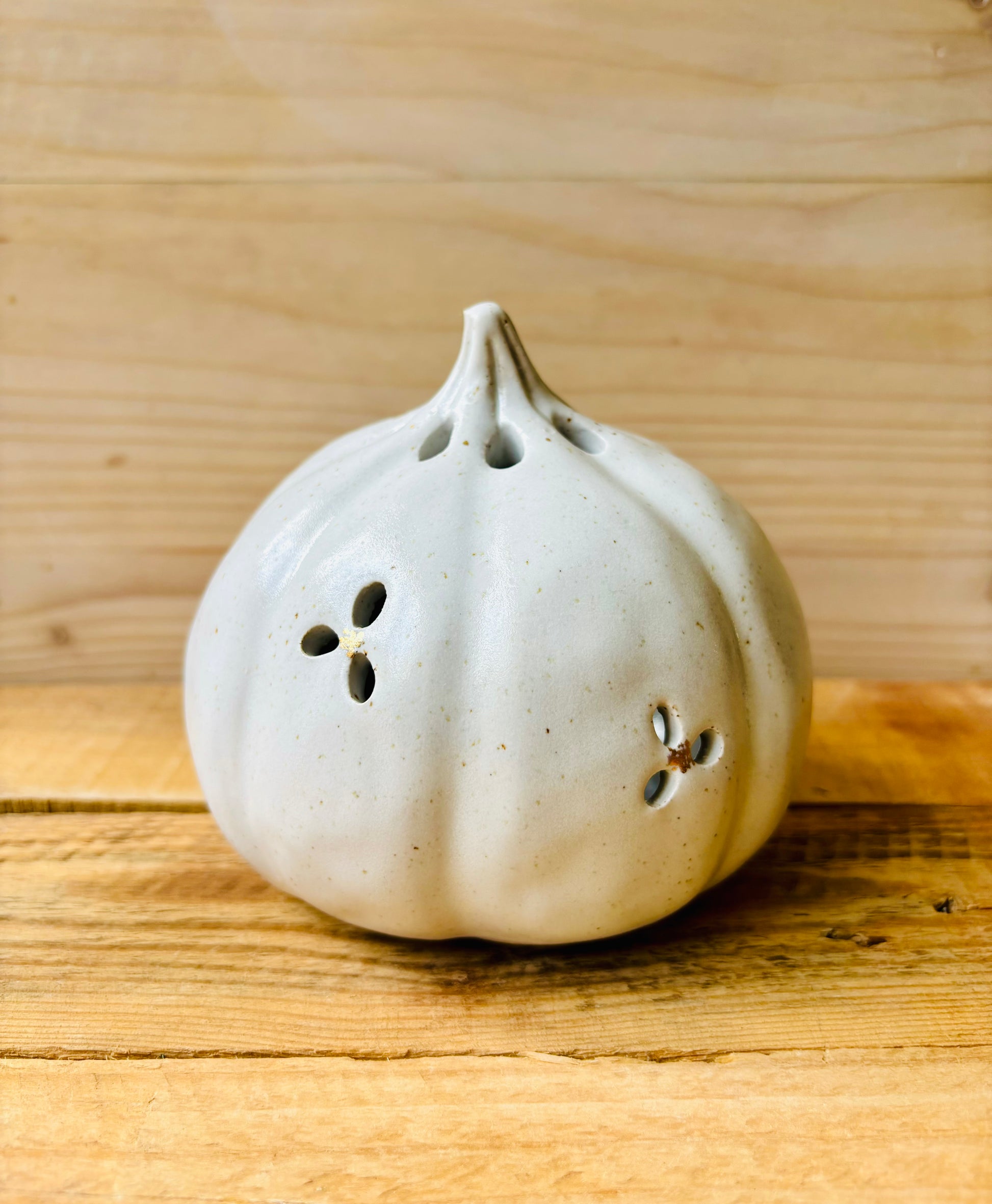 Citrouille modelée en grès pyrité et recouvert d'un email blanc satiné.