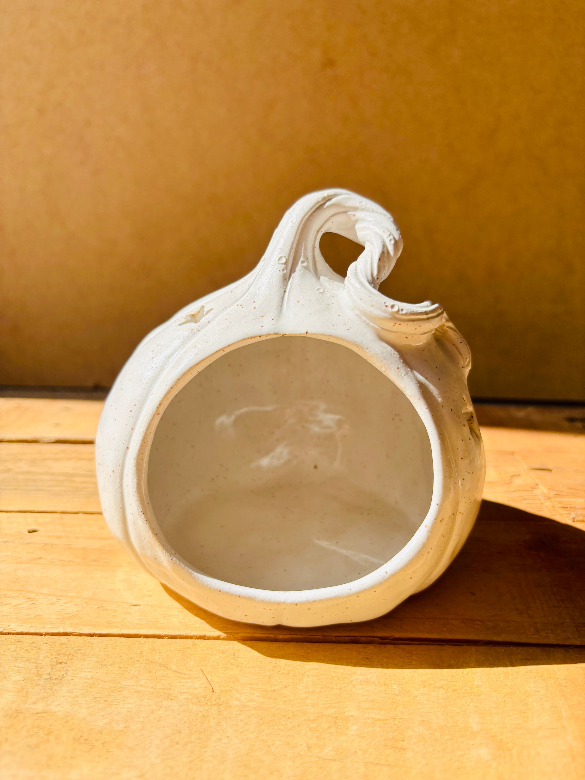 Citrouille modelée en grès pyrité et recouvert d'un email blanc satiné.