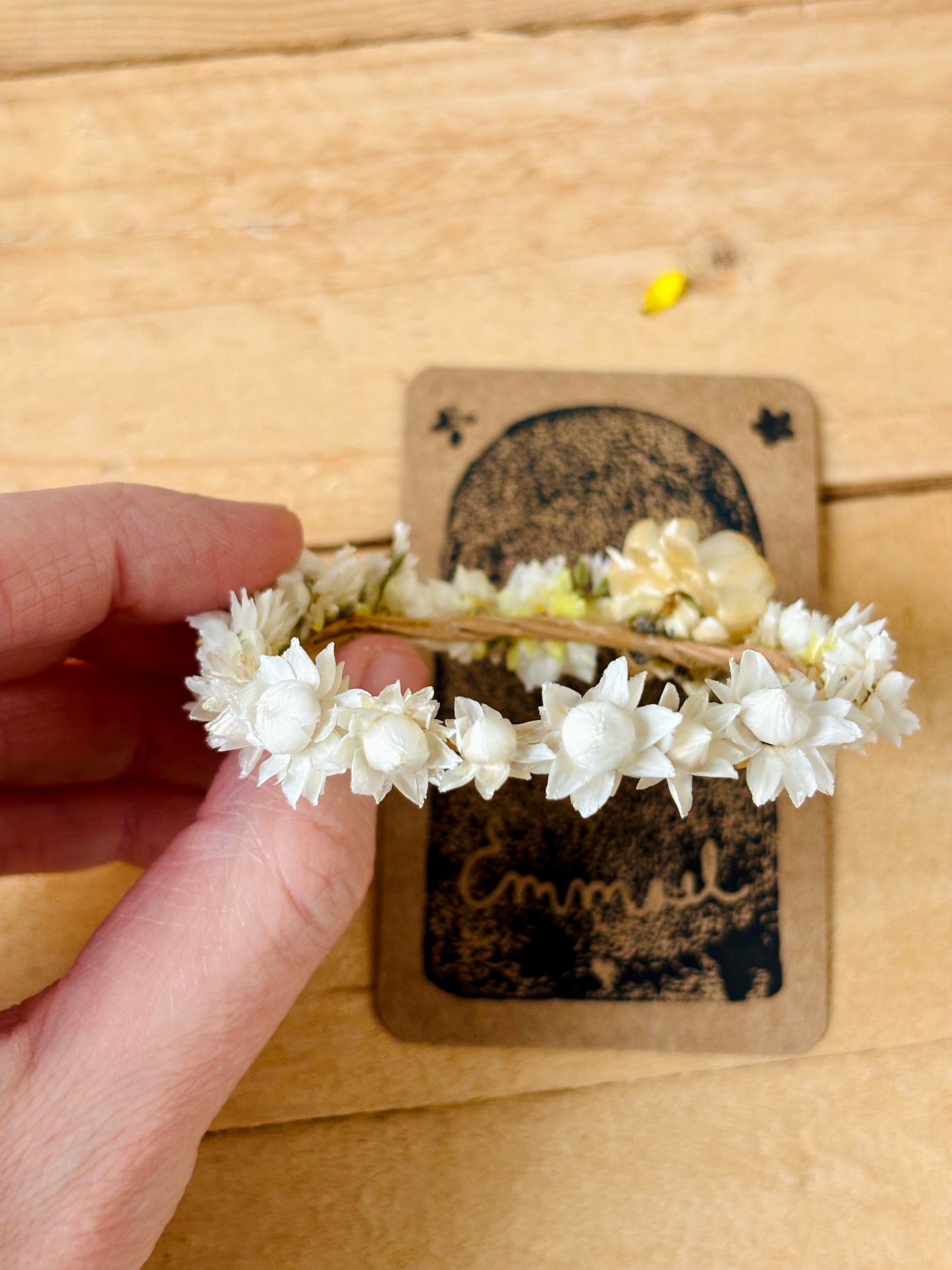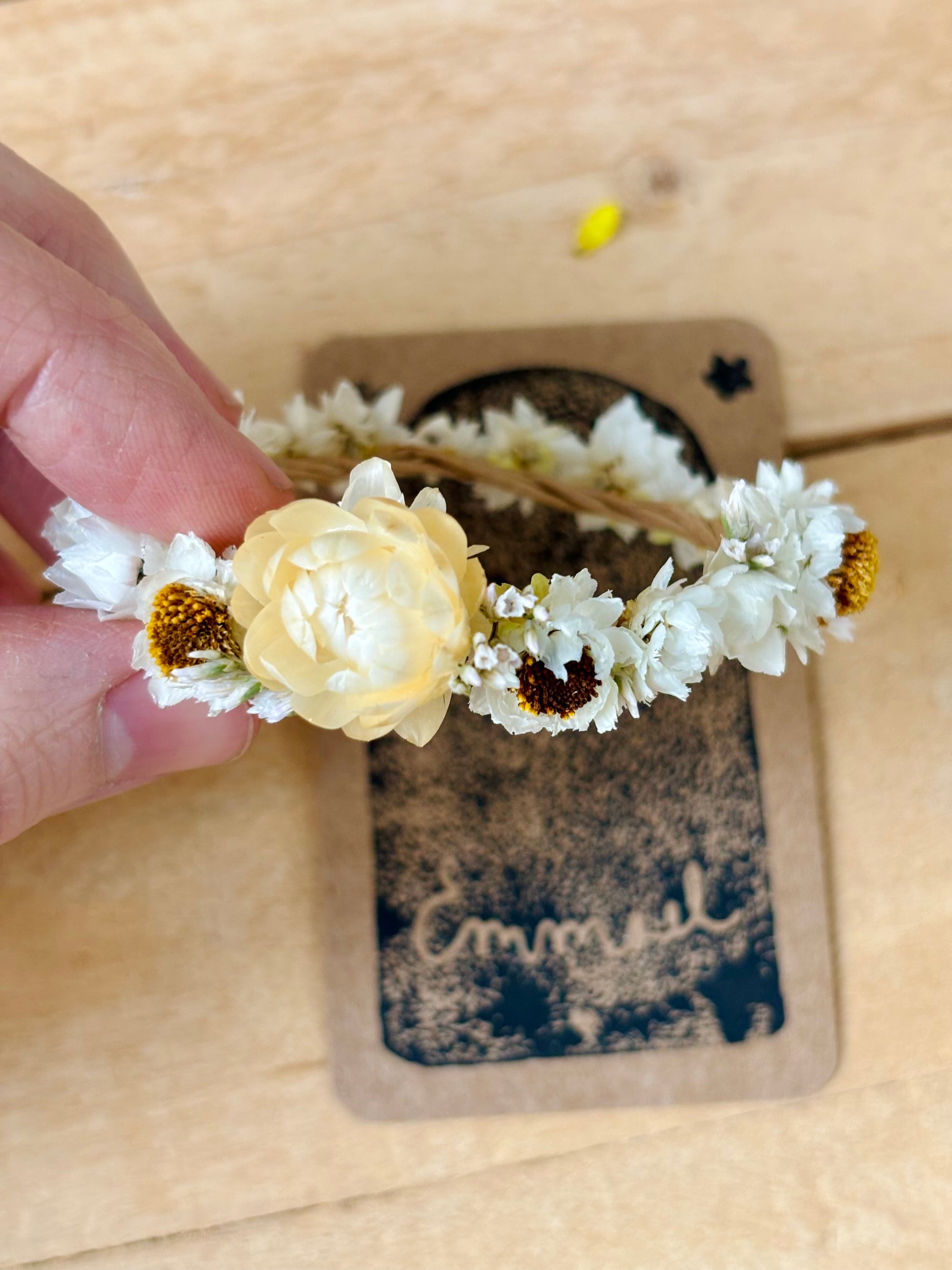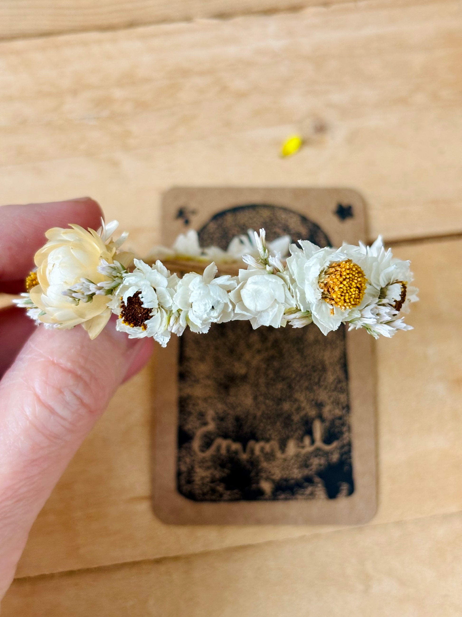 Each flower is unique due to its variety, its size and the intensity of its color. This crown is composed and assembled by hand.