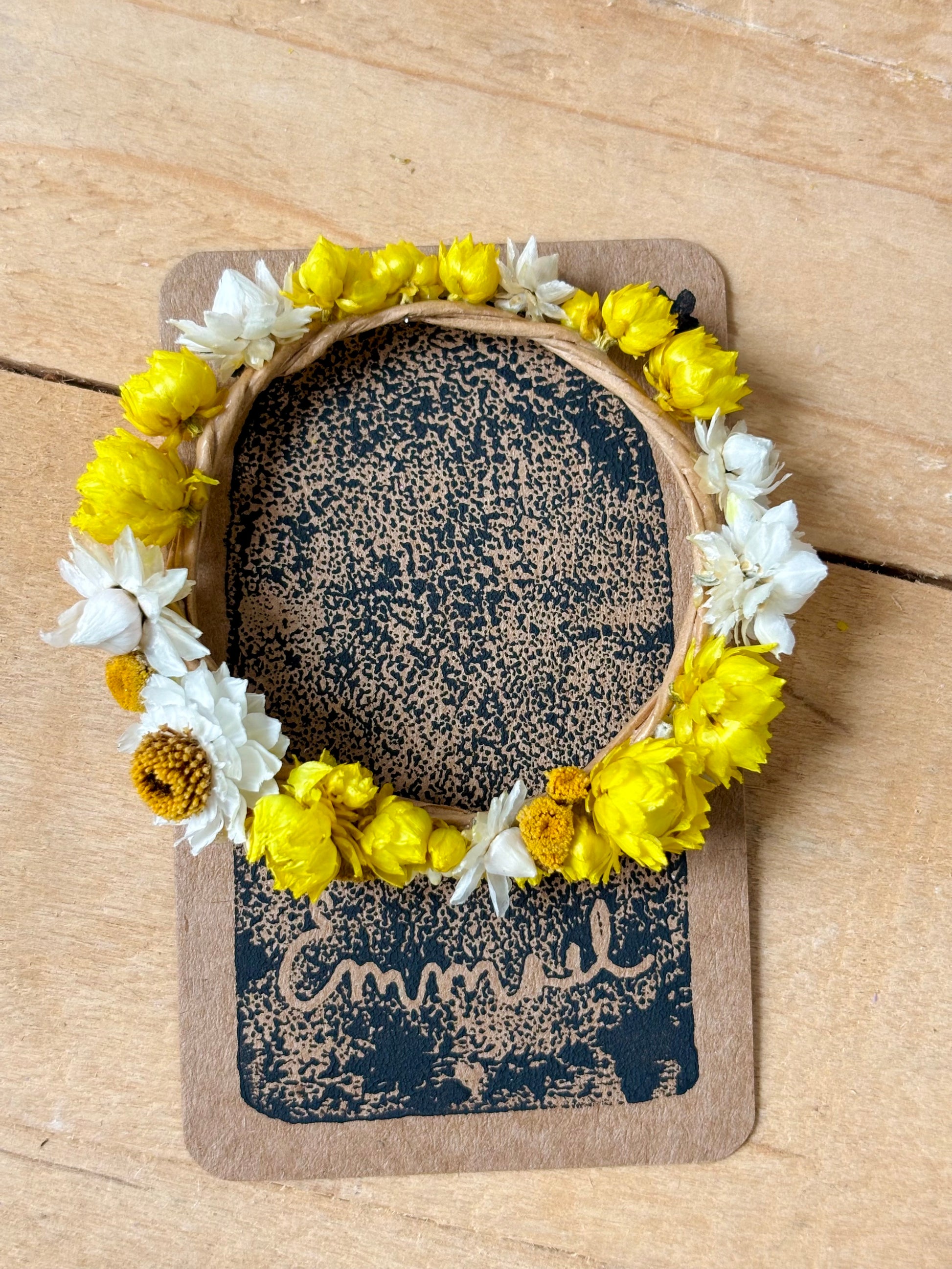 Dried flowers glued to a wire wreath coated with paper, rattan effect.