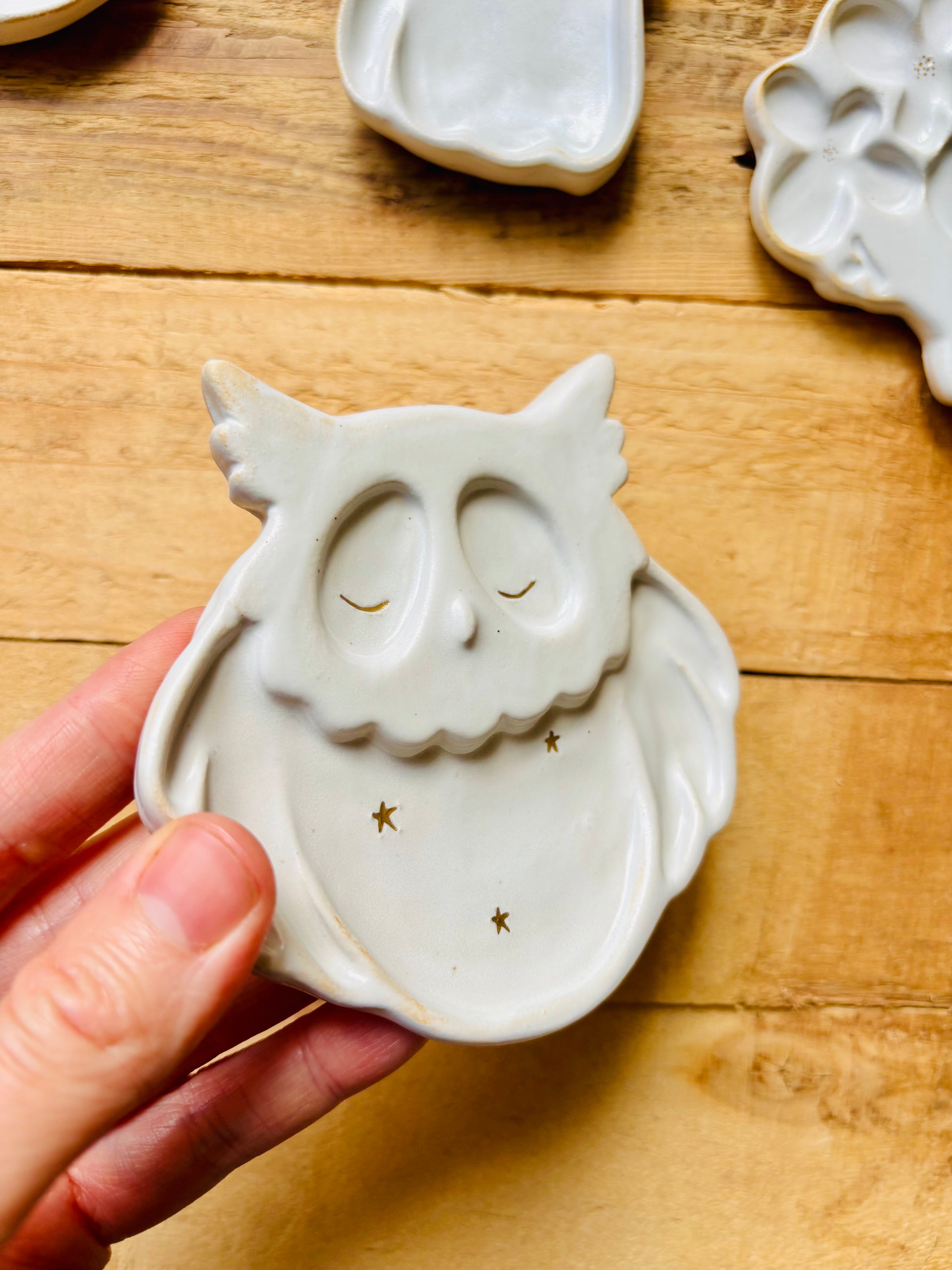 Hibou modelé en grès blanc et recouvert d'un email blanc satiné.