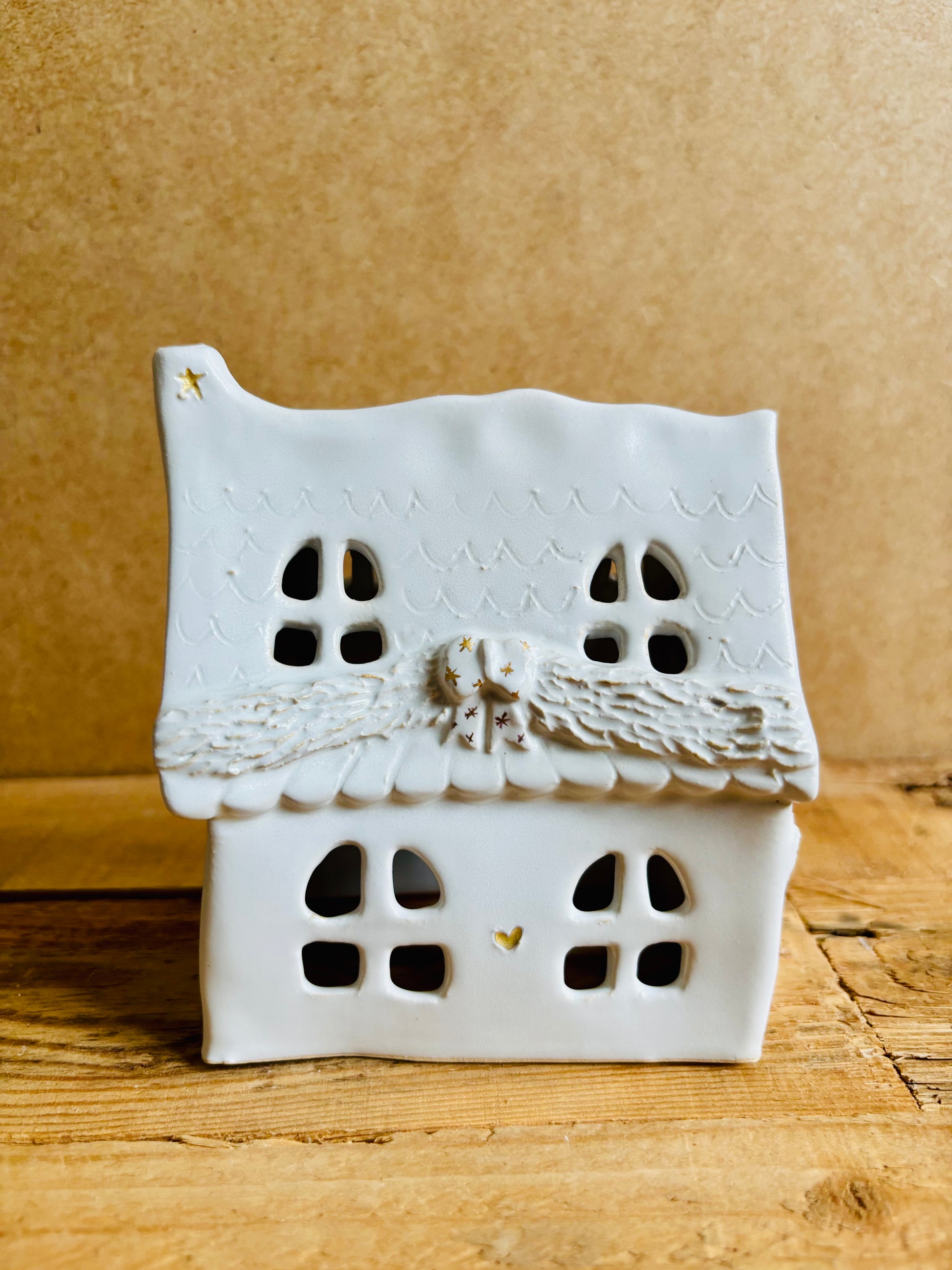 House modeled in white sandstone and covered with a satin white glaze enhanced with small touches of gold.