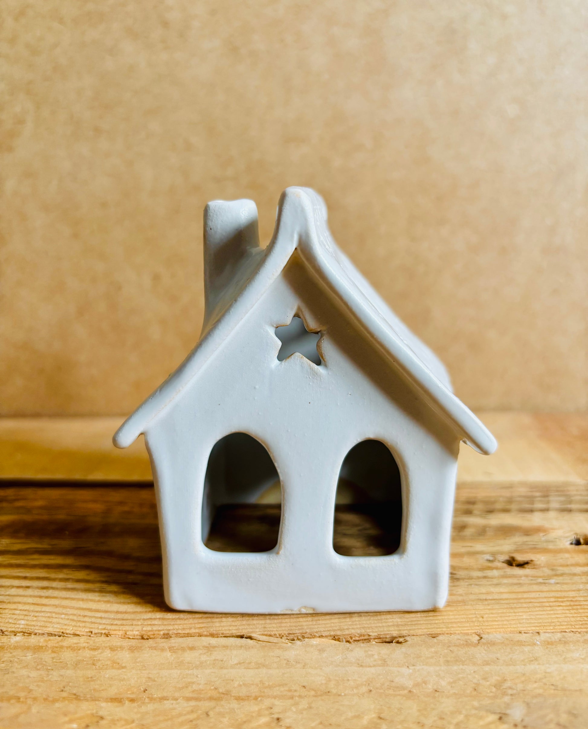 House modeled in white sandstone and covered with a satin white glaze enhanced with small touches of gold.