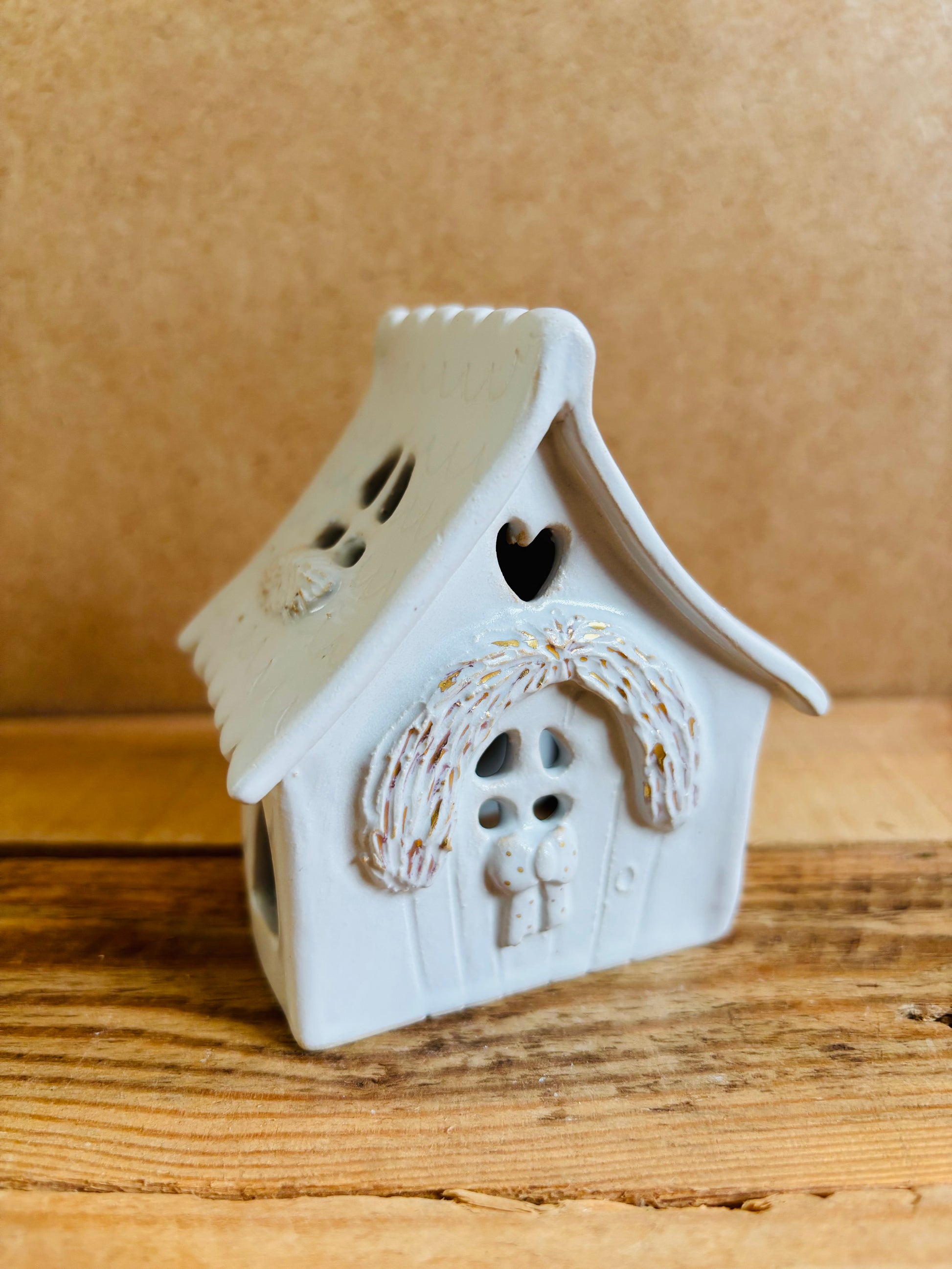 House modeled in white sandstone and covered with a satin white glaze enhanced with small touches of gold.