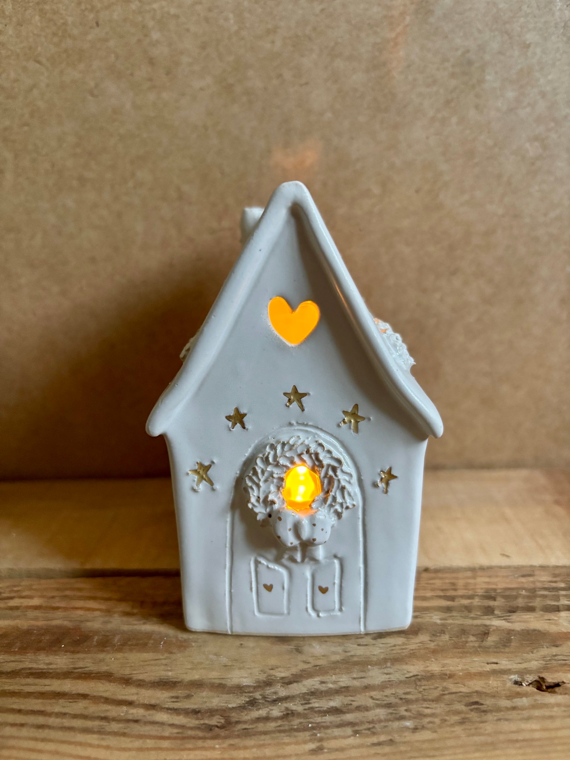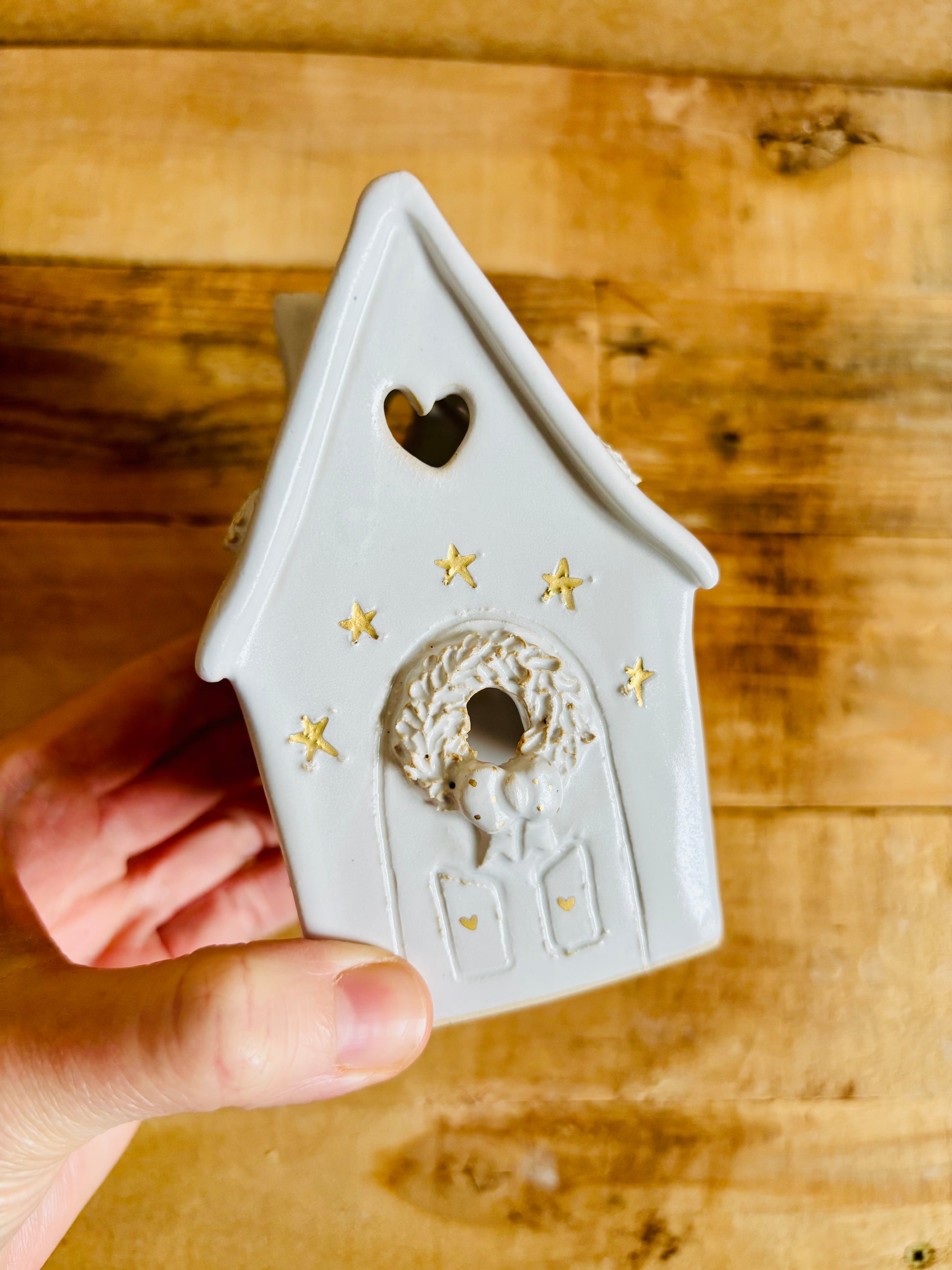 House modeled in white sandstone and covered with a satin white glaze enhanced with small touches of gold.