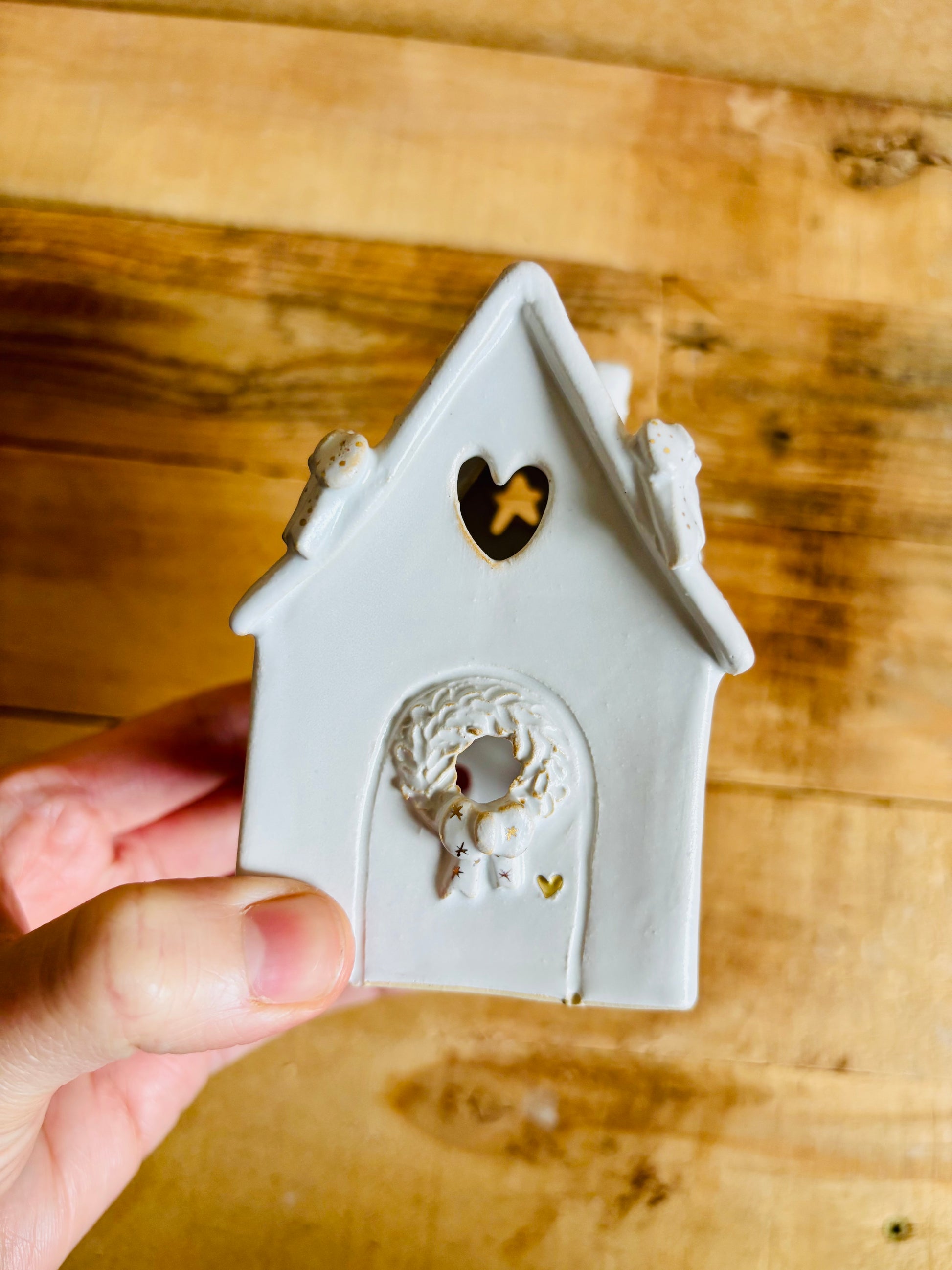 Maison photophore en céramique décorée de petites touches d'or.