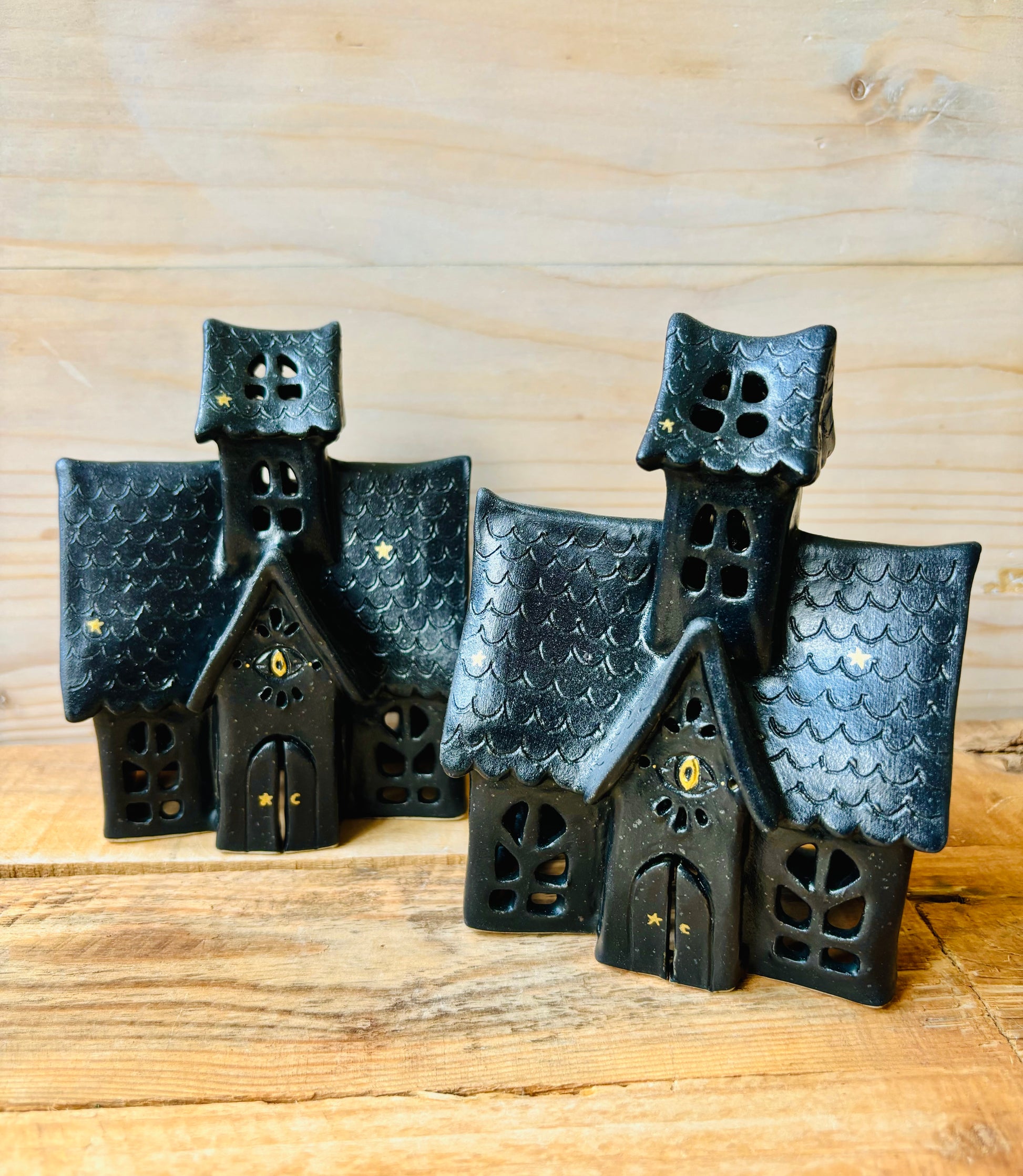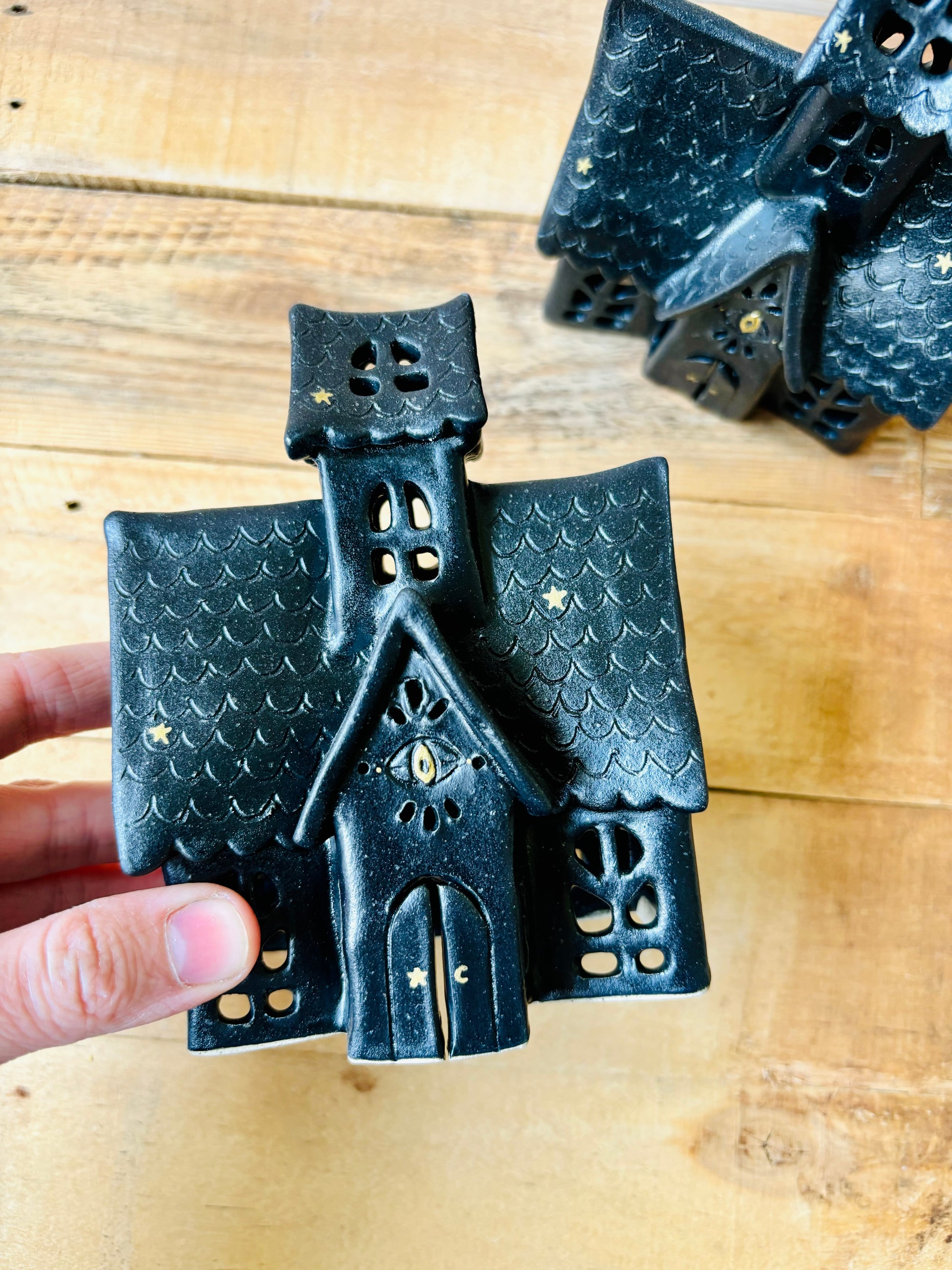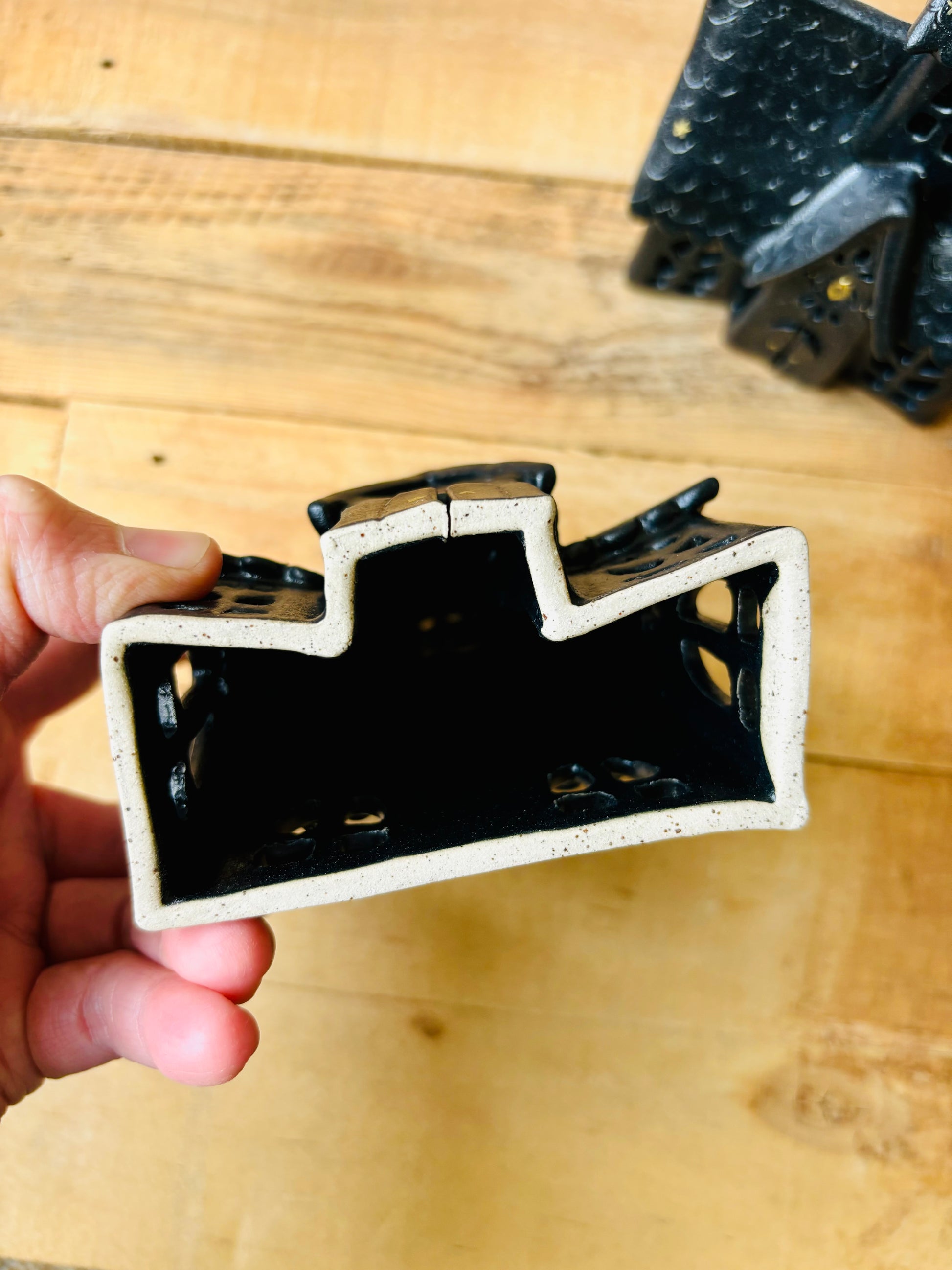 Maison modelée en grès pyrité et recouvert d'un email noir satiné sublimé de petites touches dorées.