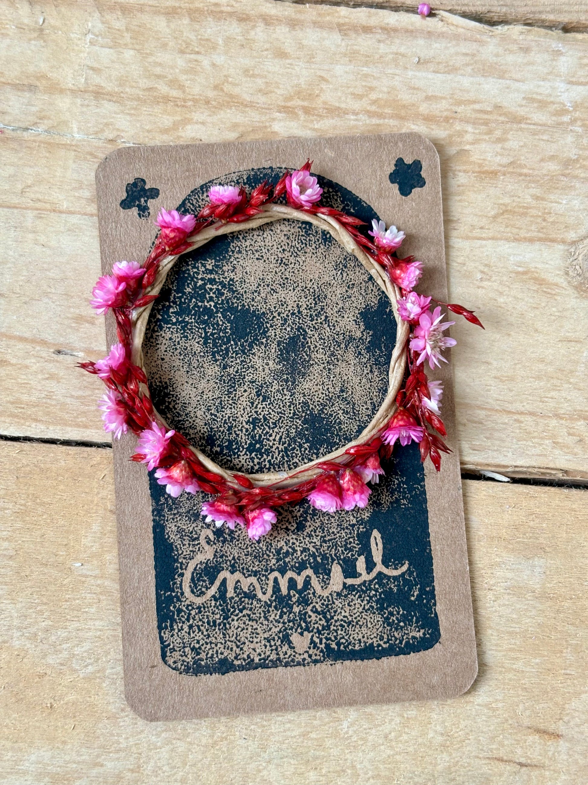 Each flower is unique due to its variety, its size and the intensity of its color. This crown is composed and assembled by hand.
