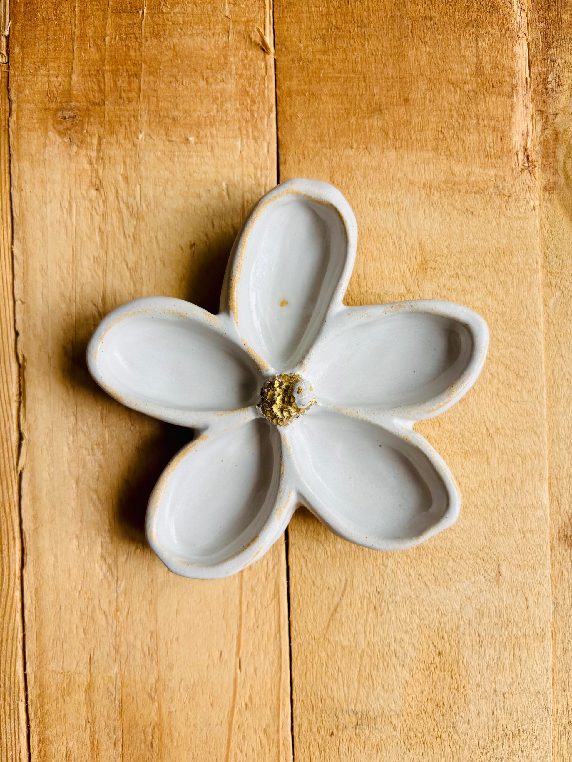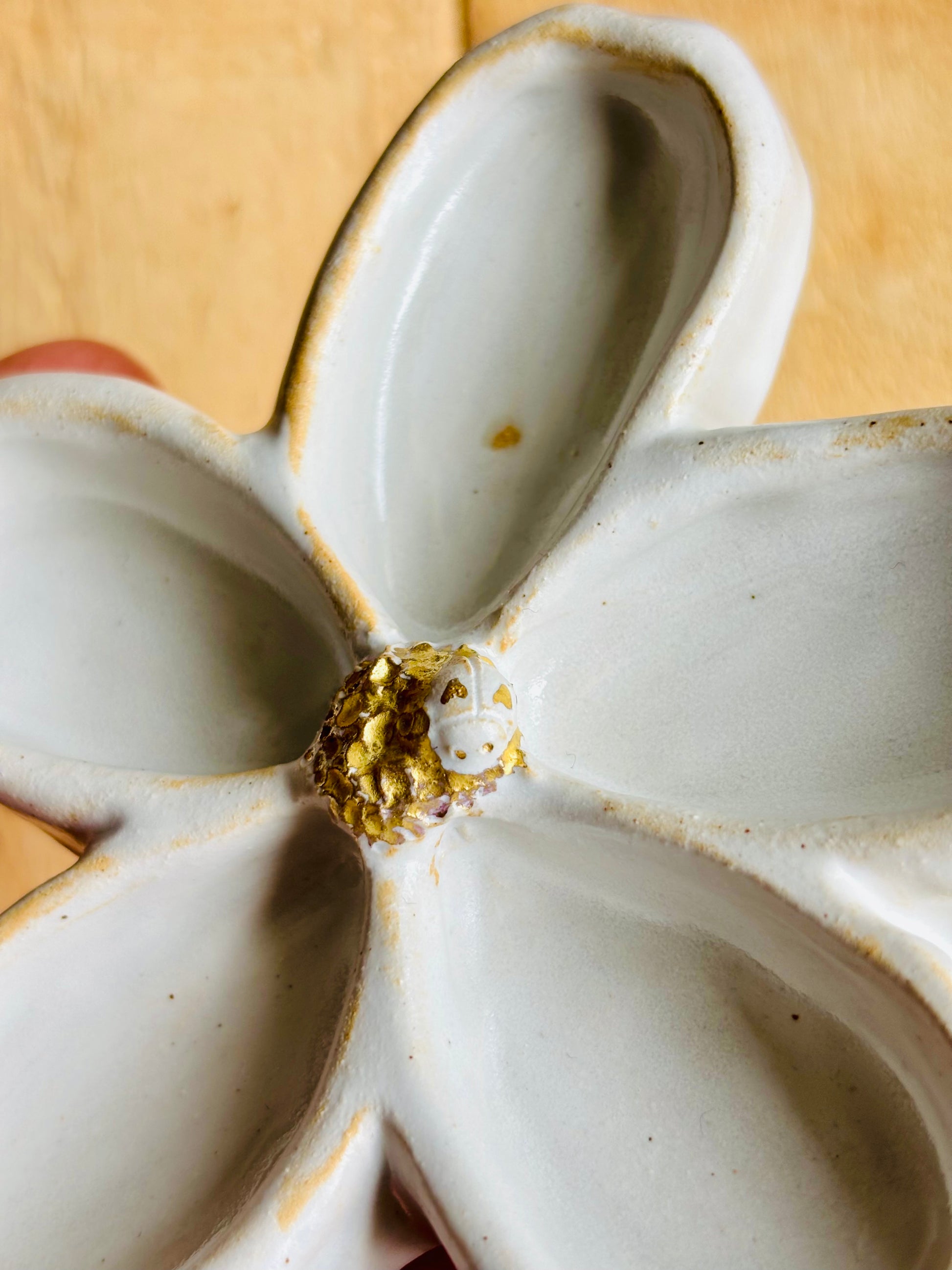Palette en céramique en forme de fleur. Une coccinelle s'est endormie sur le pistil.