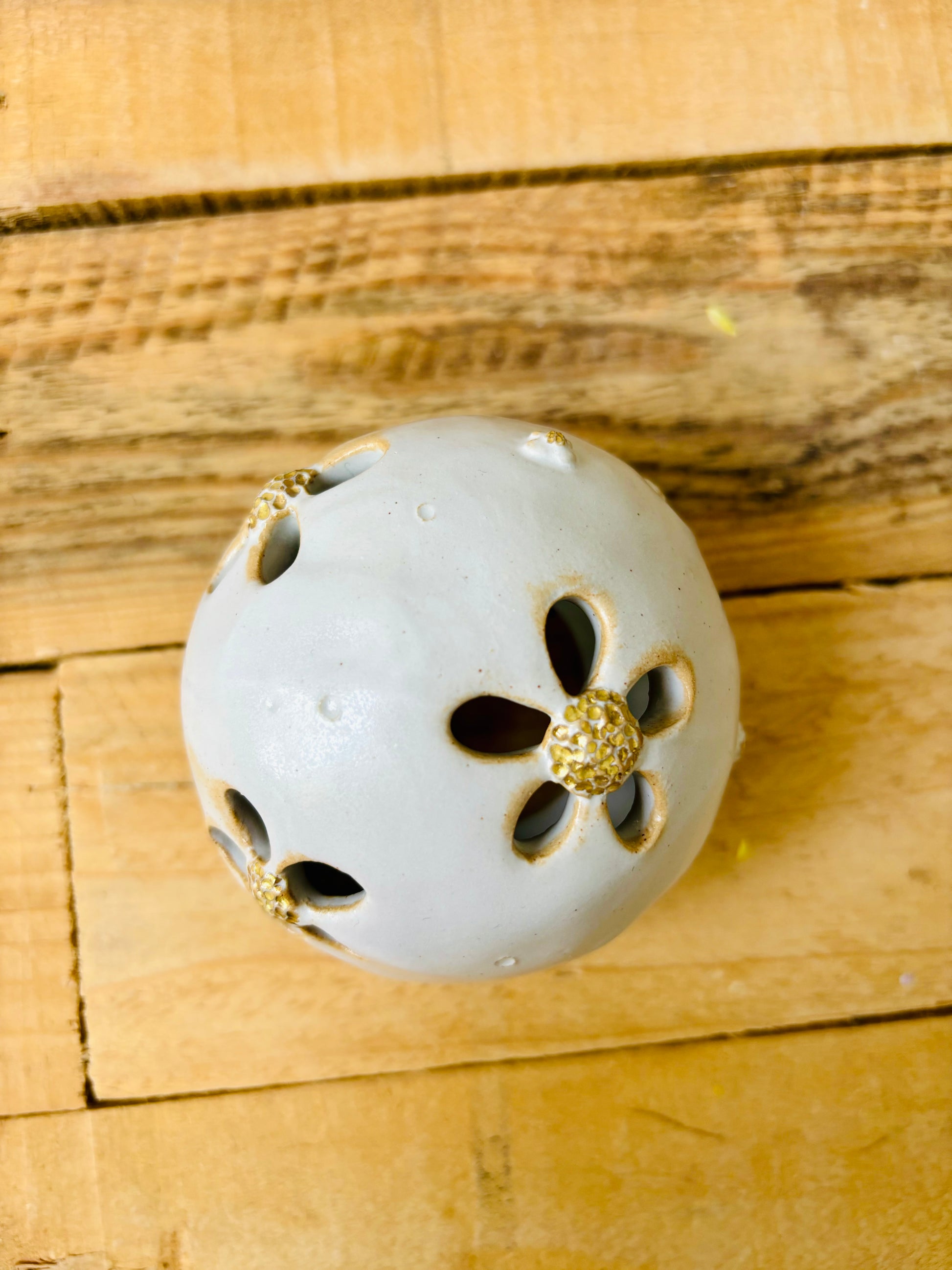This sphere comes with an LED tea light with flickering flame (battery included).
