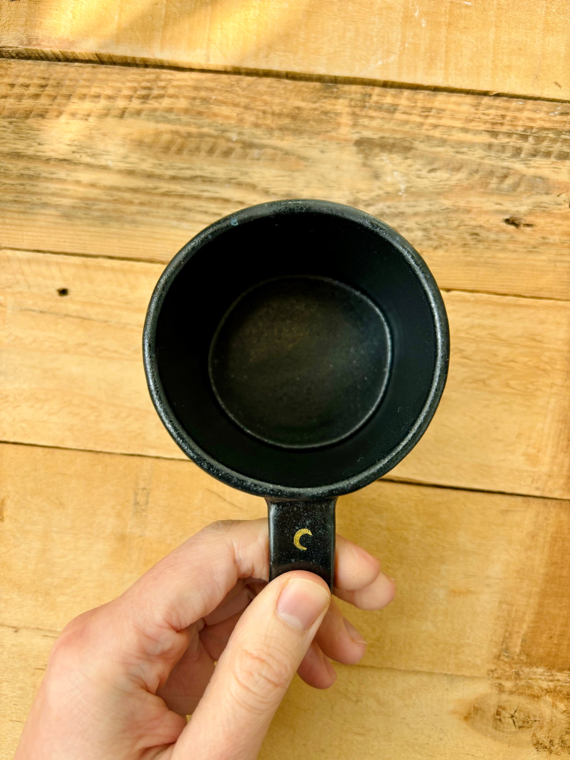 Cup modeled in pyrite stoneware and covered with satin black glaze.