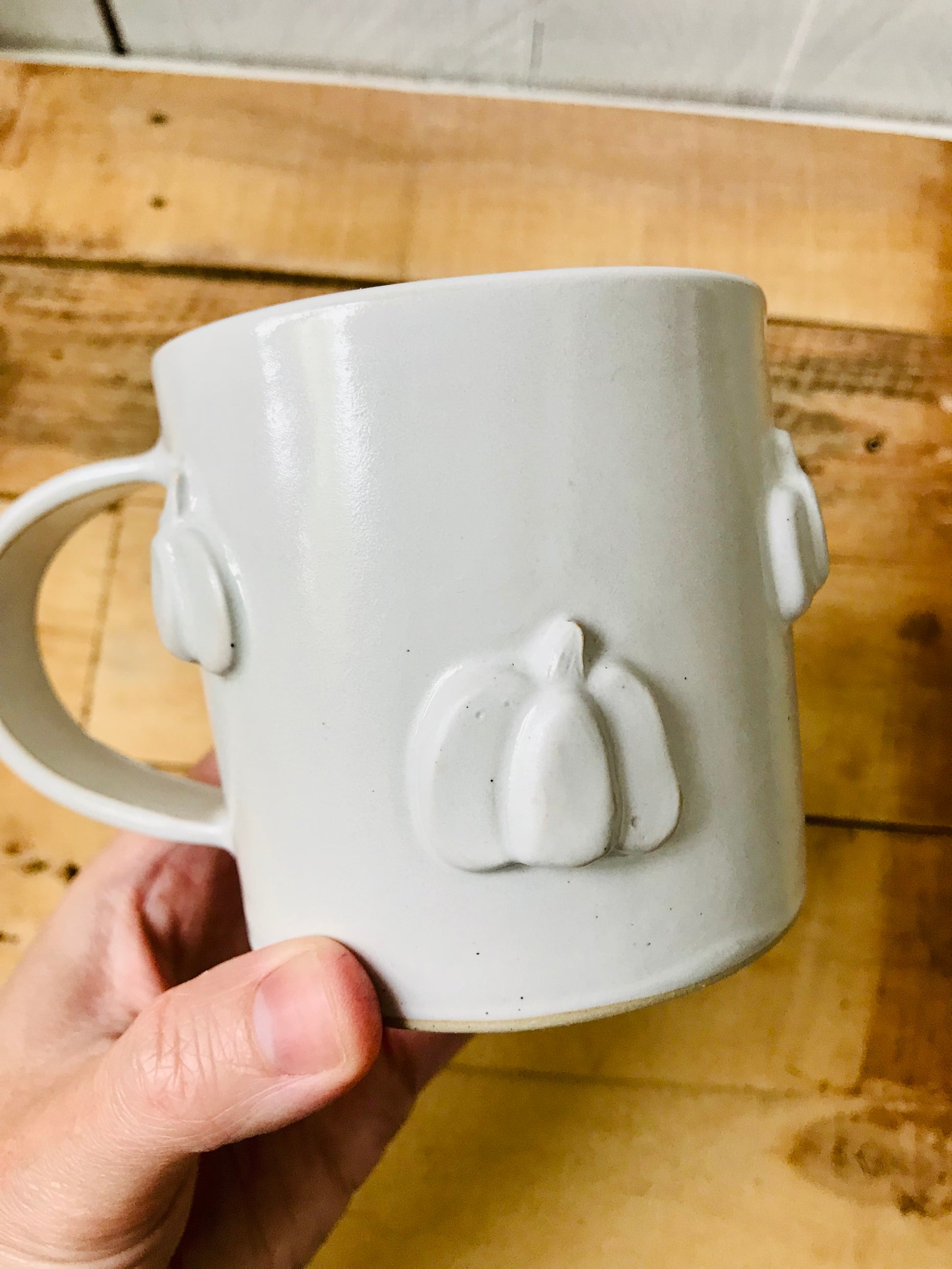 Ceramic mug decorated with small white pumpkins.