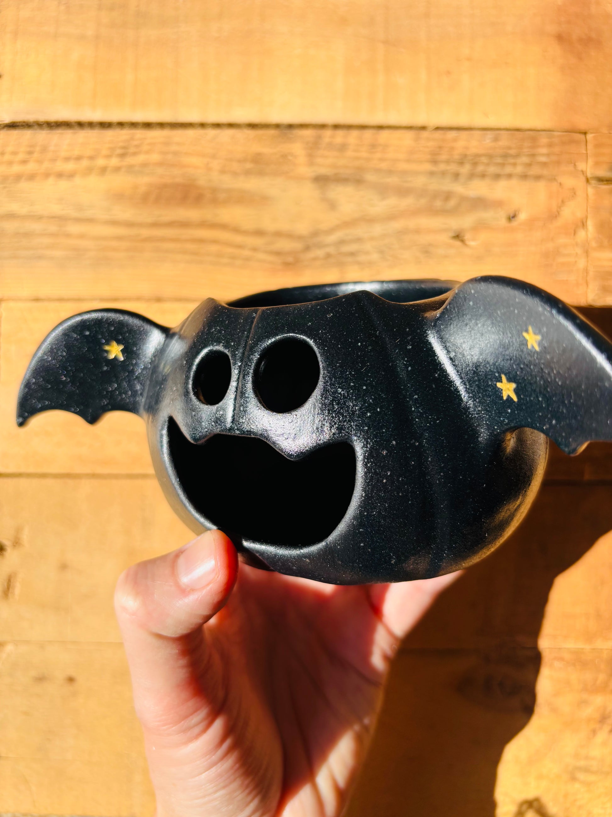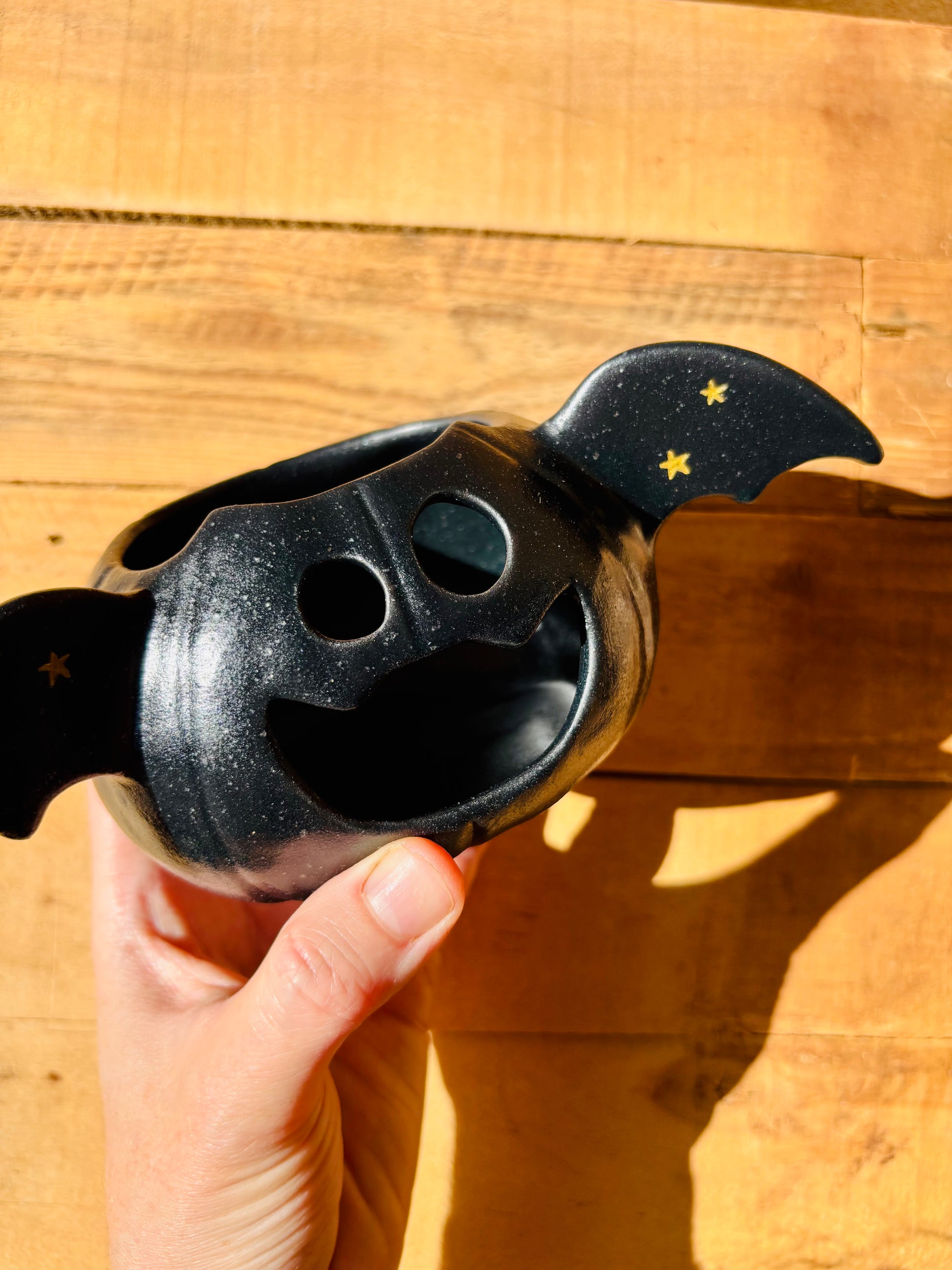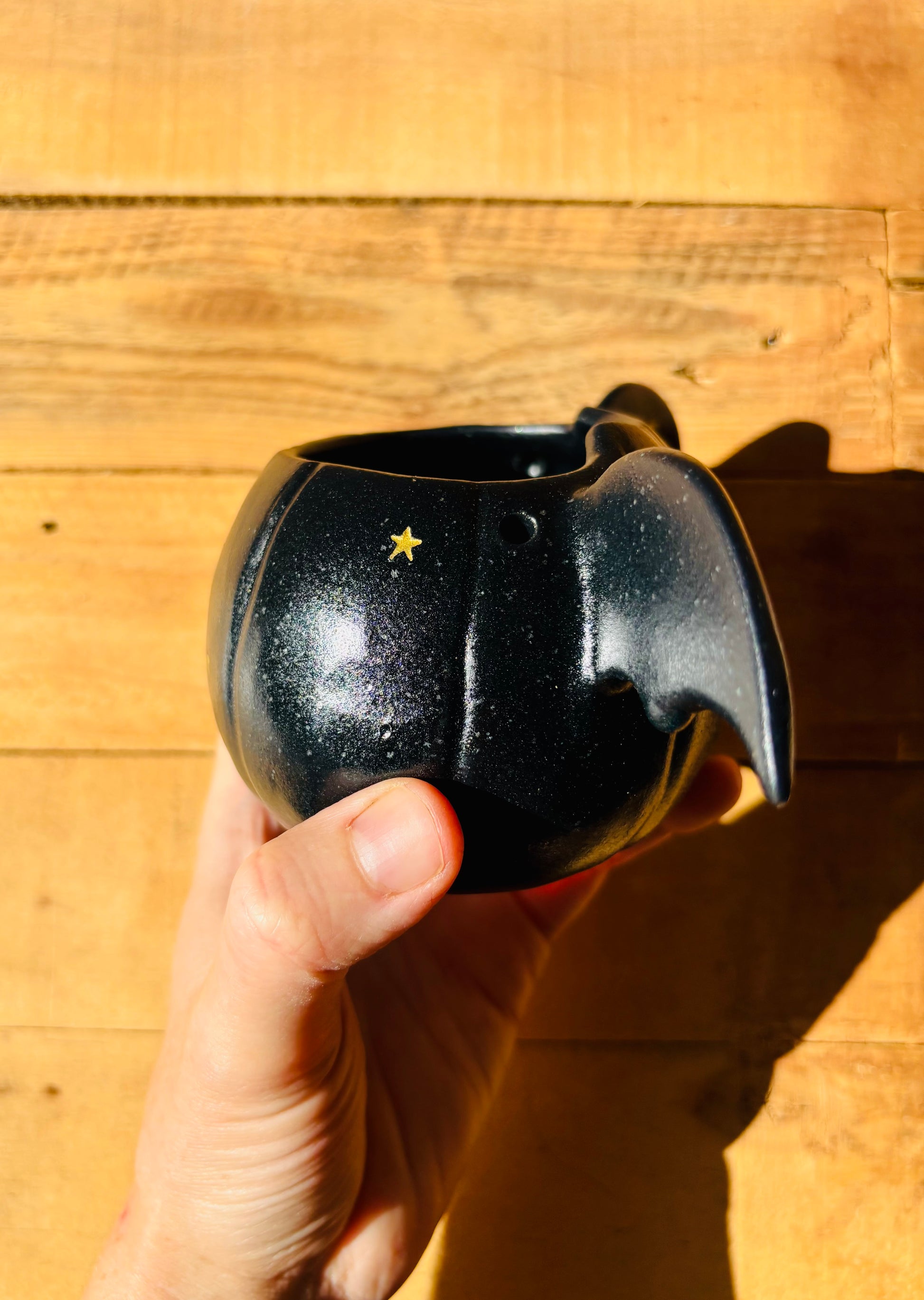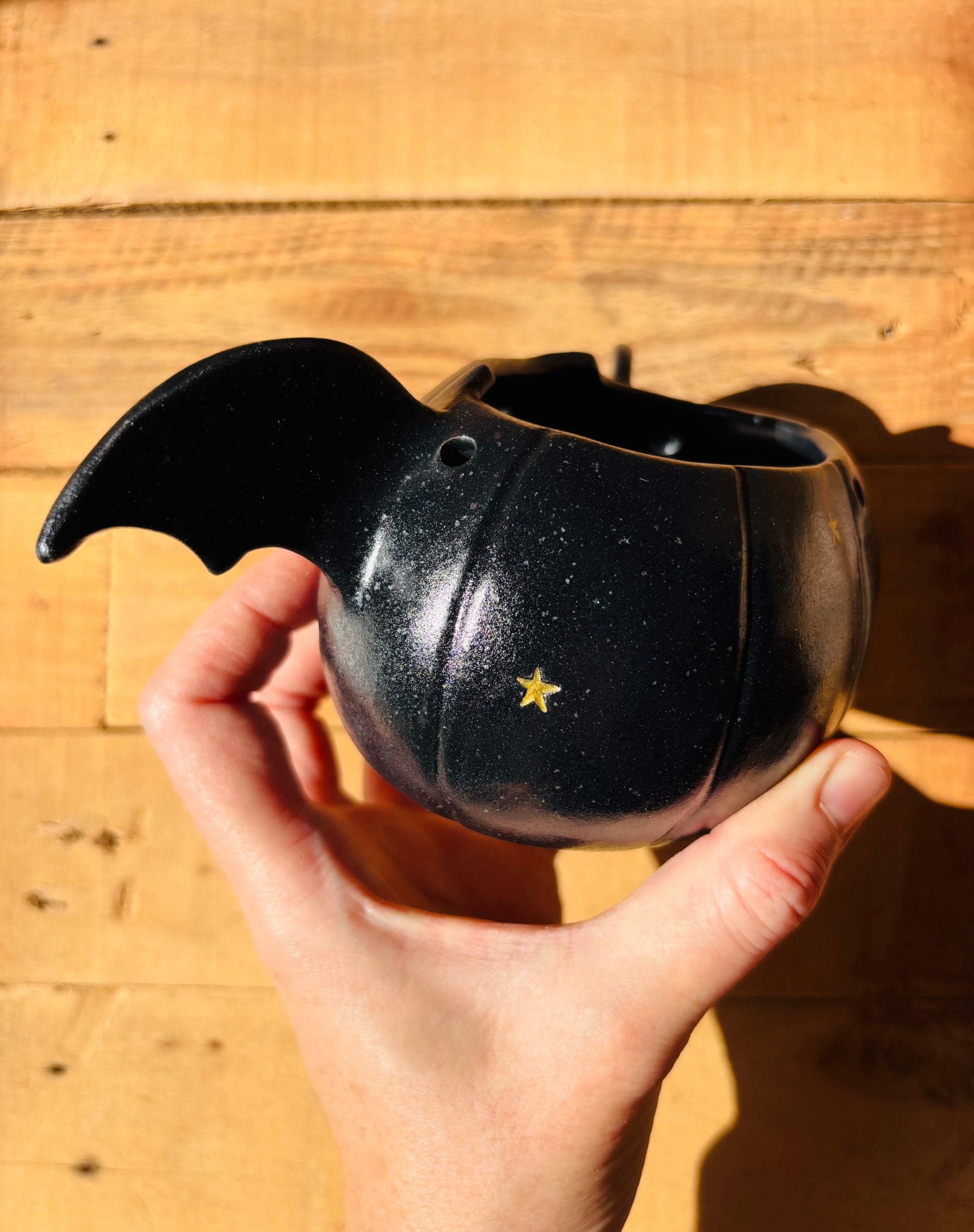 Chauve-souris modelée en grès pyrité et recouvert d'un email noir satiné.