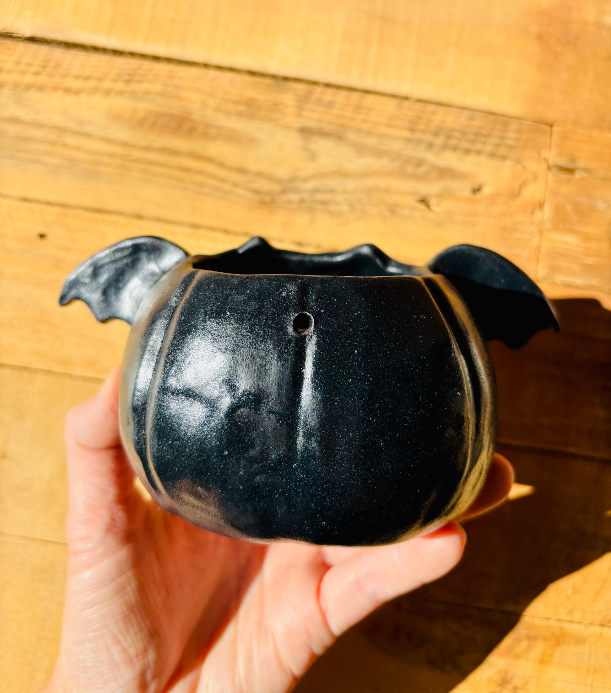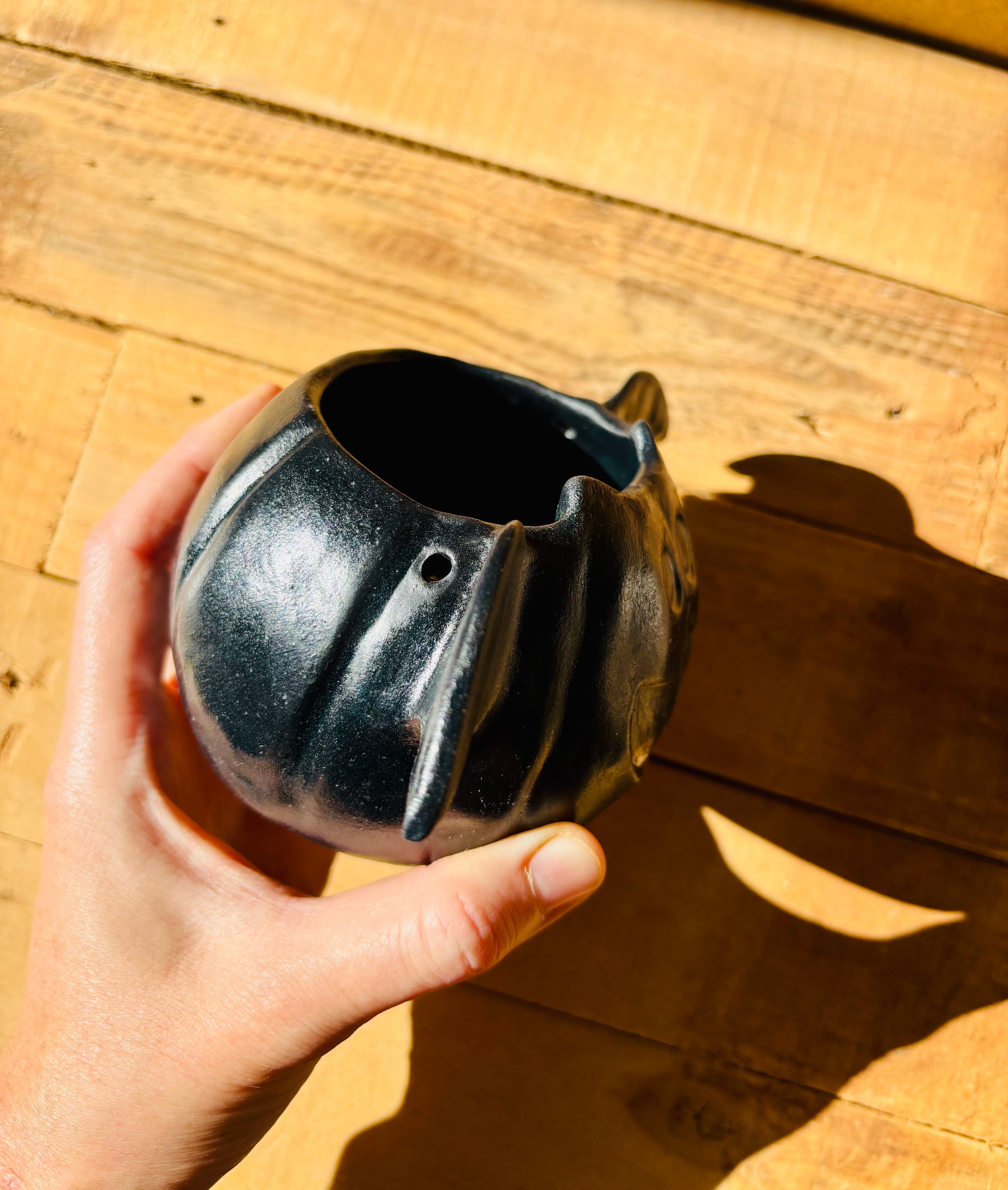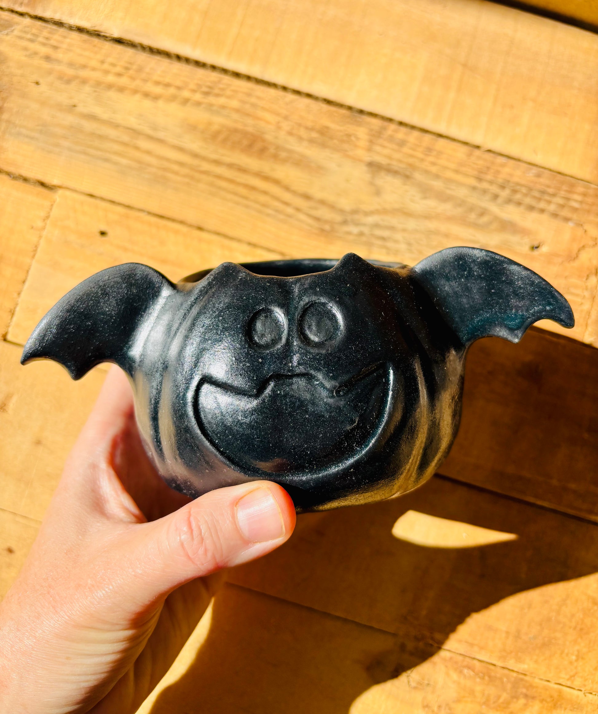Chauve-souris modelée en grès pyrité et recouvert d'un email noir satiné.