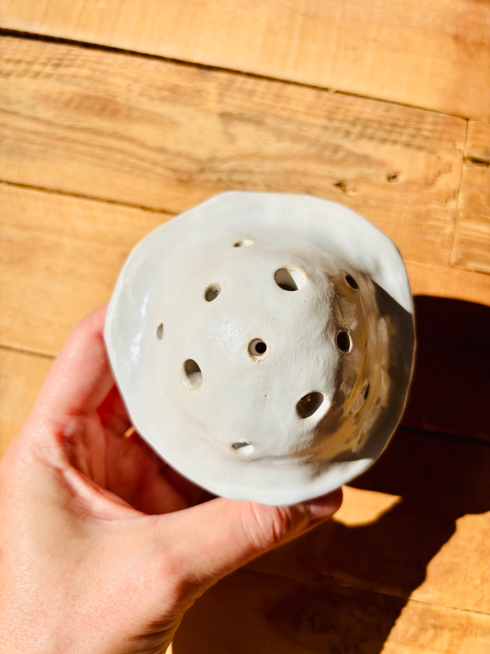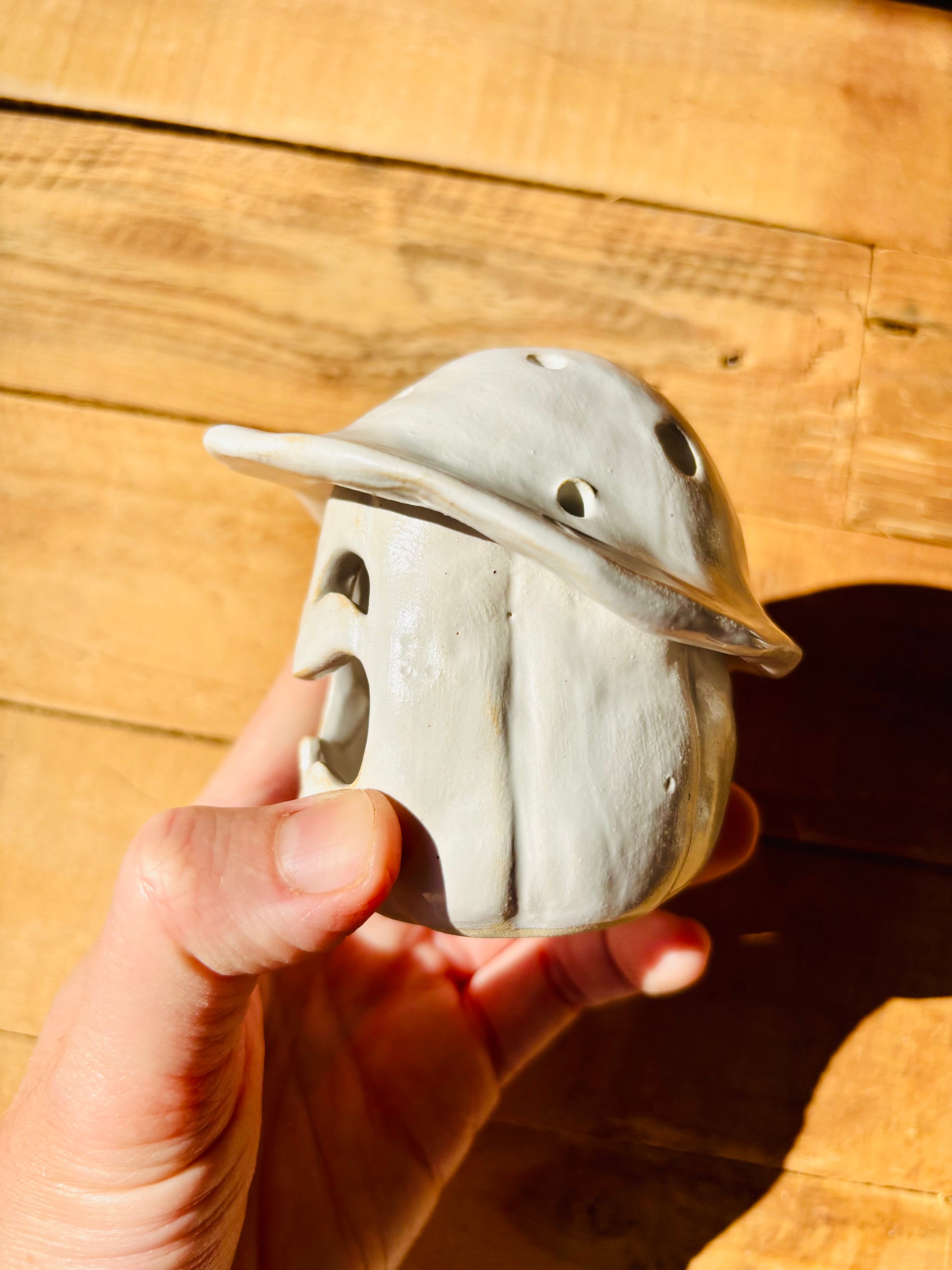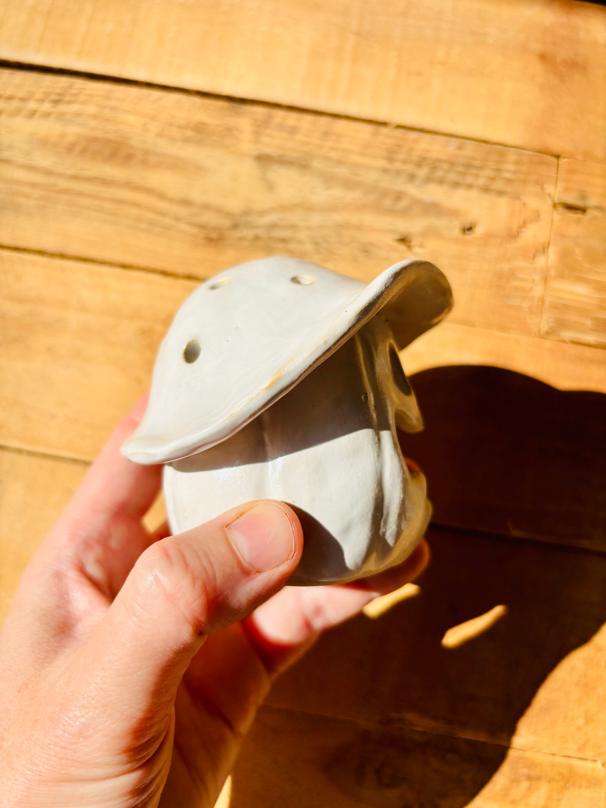 Champignon modelé en grès blanc et recouvert d'un email blanc satiné.