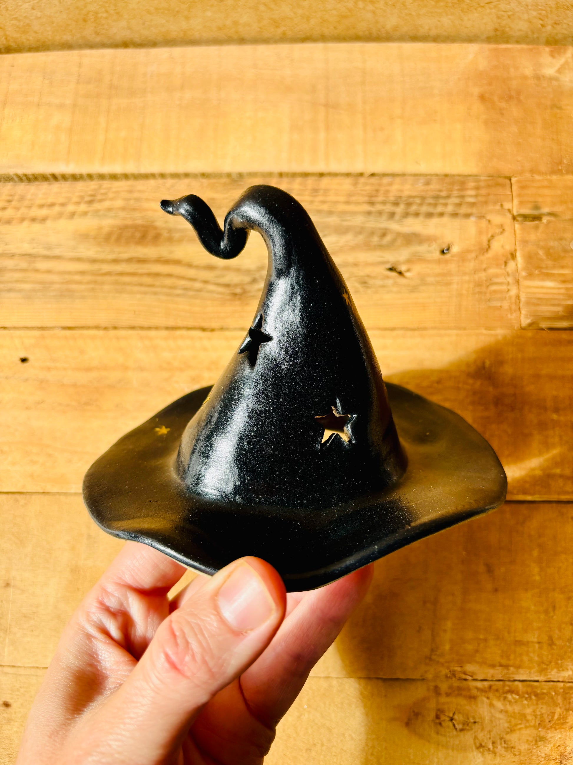 Chapeau de sorcière modelé en grès pyrité et recouvert d'un email noir satiné.