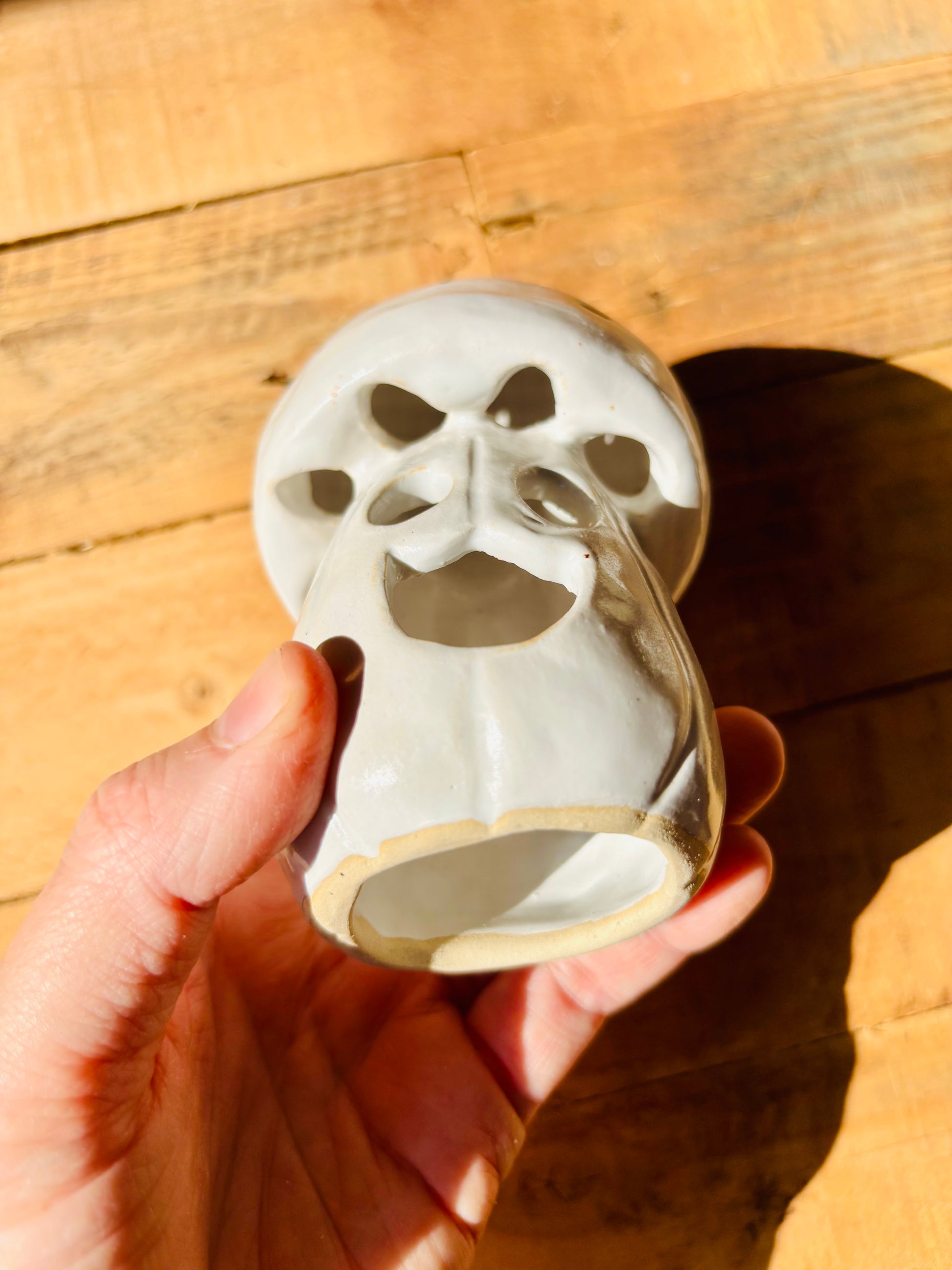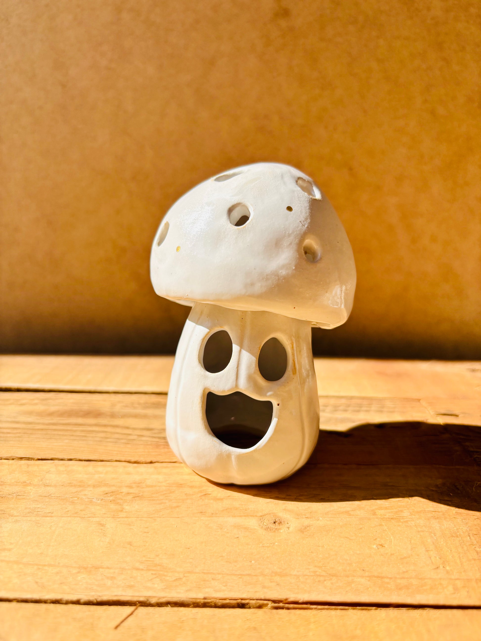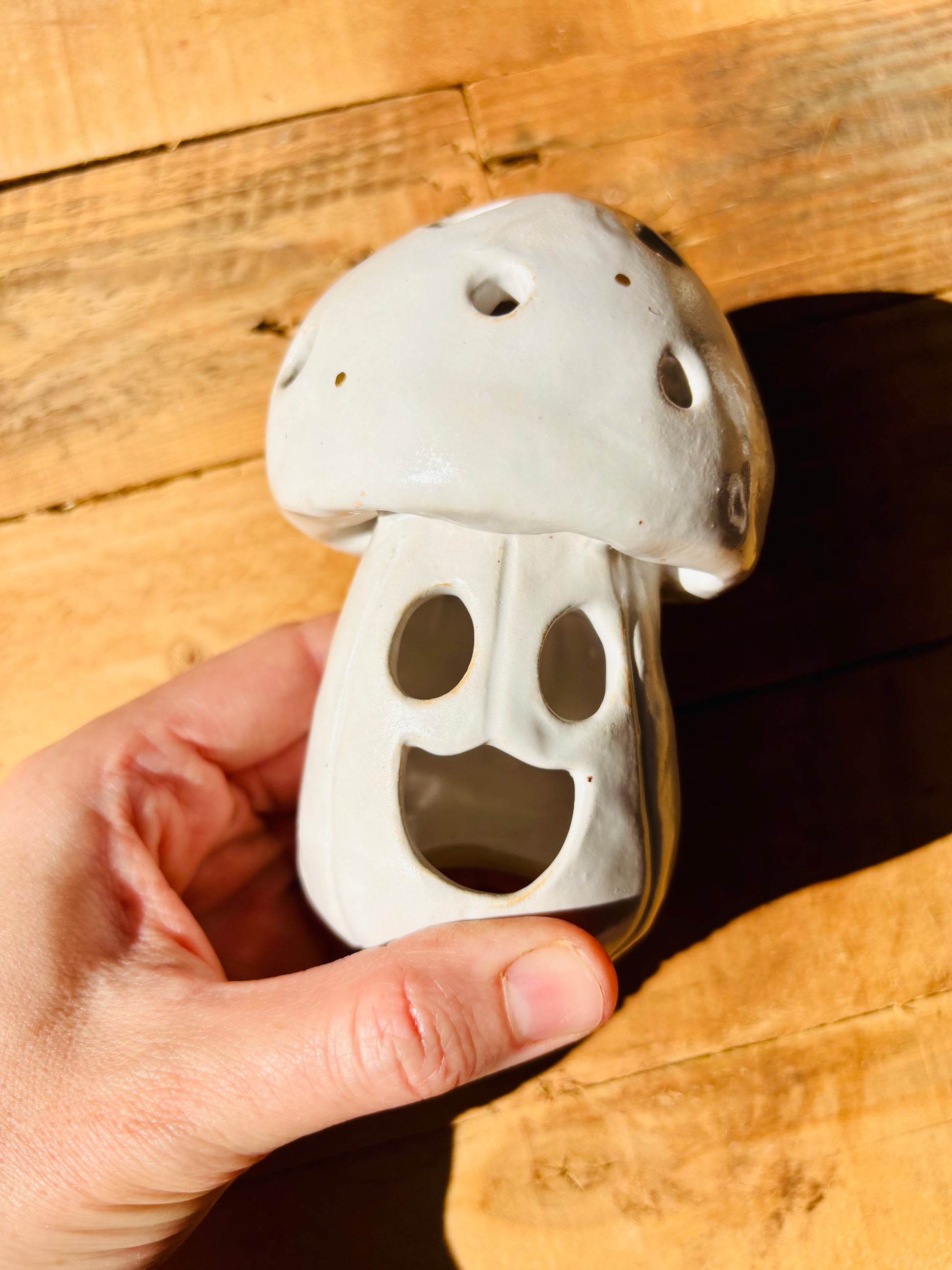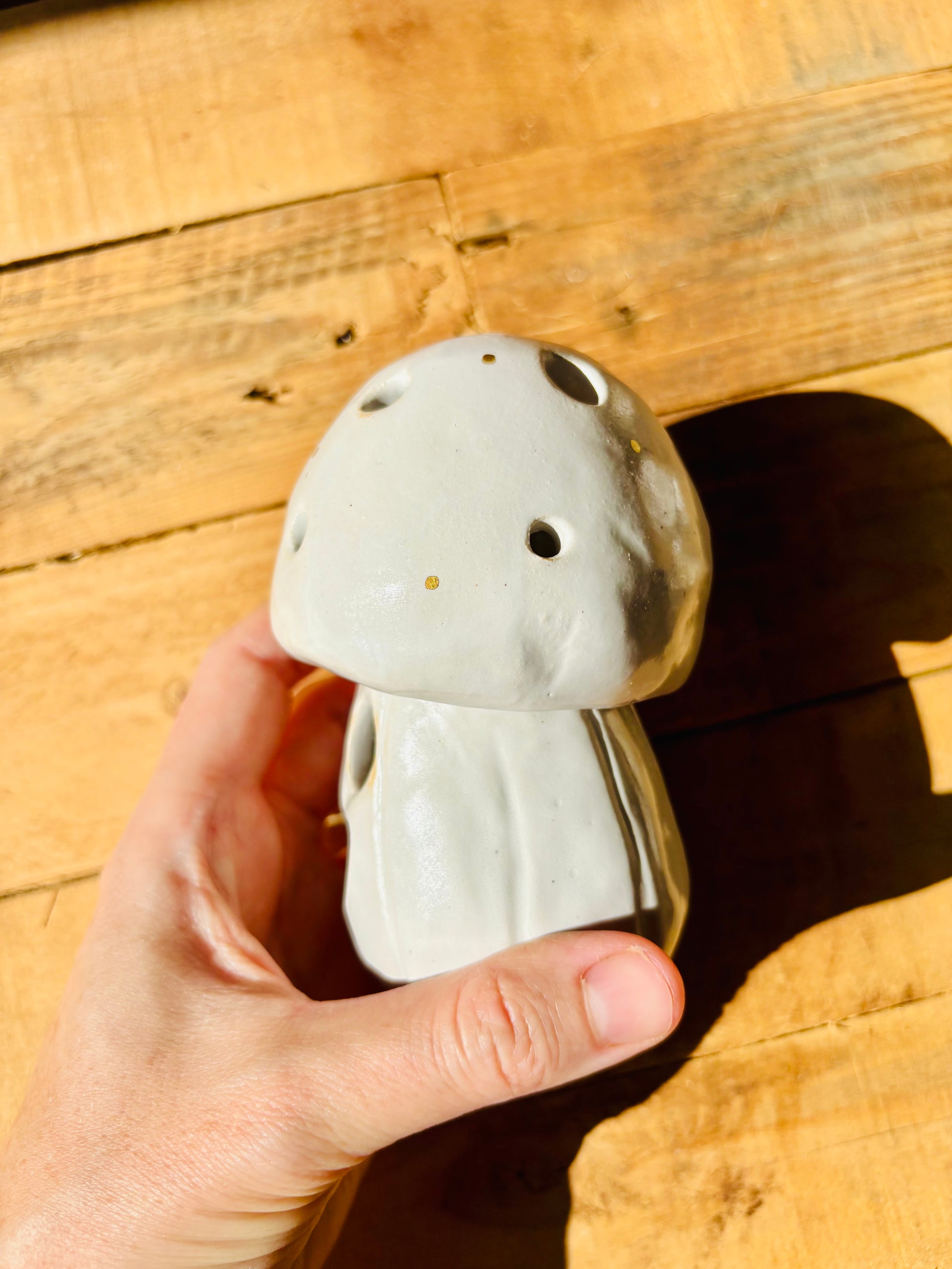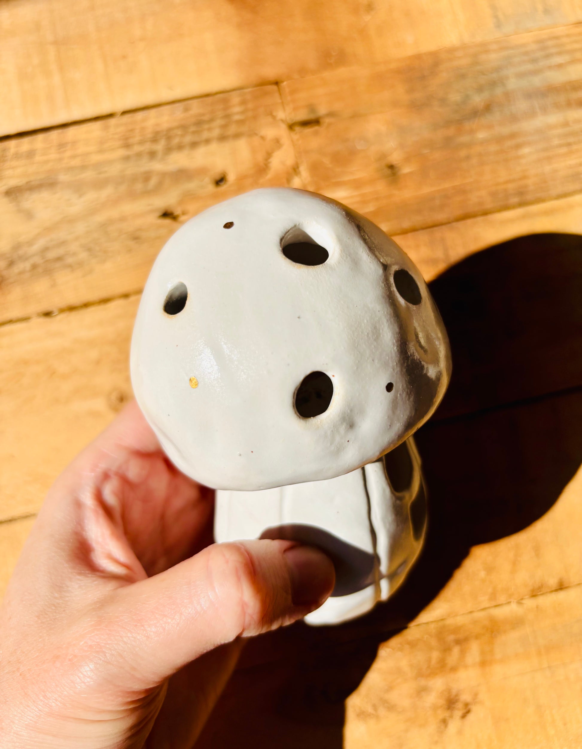 Champignon modelé en grès blanc et recouvert d'un email blanc satiné.