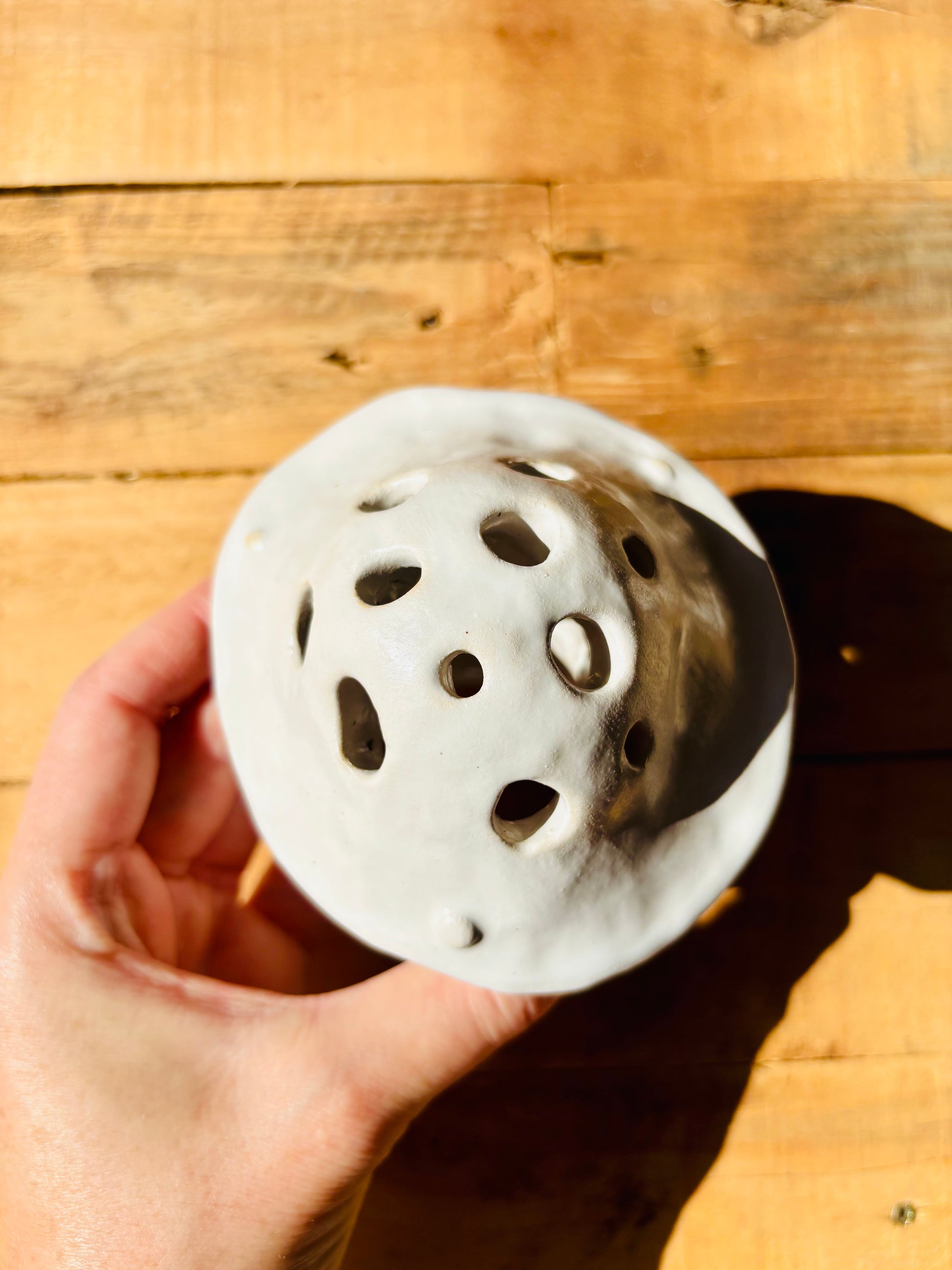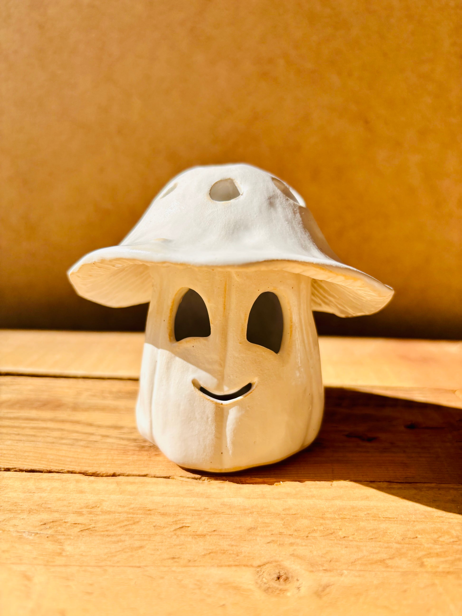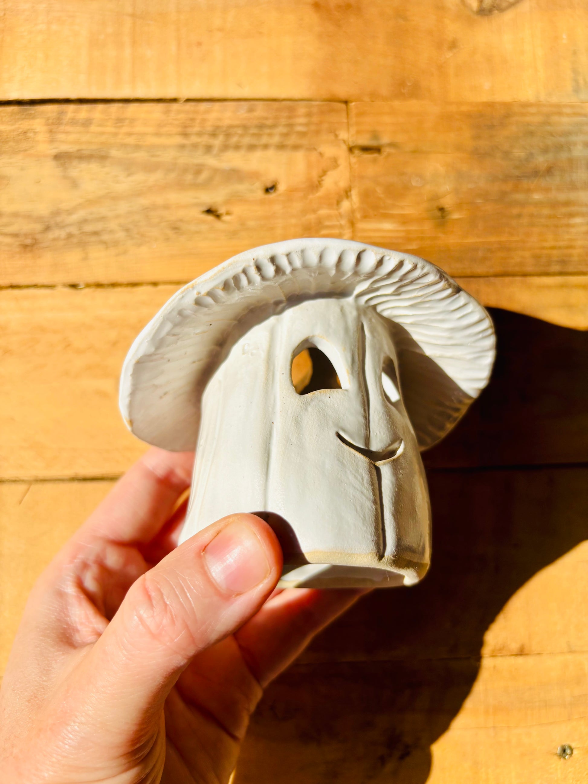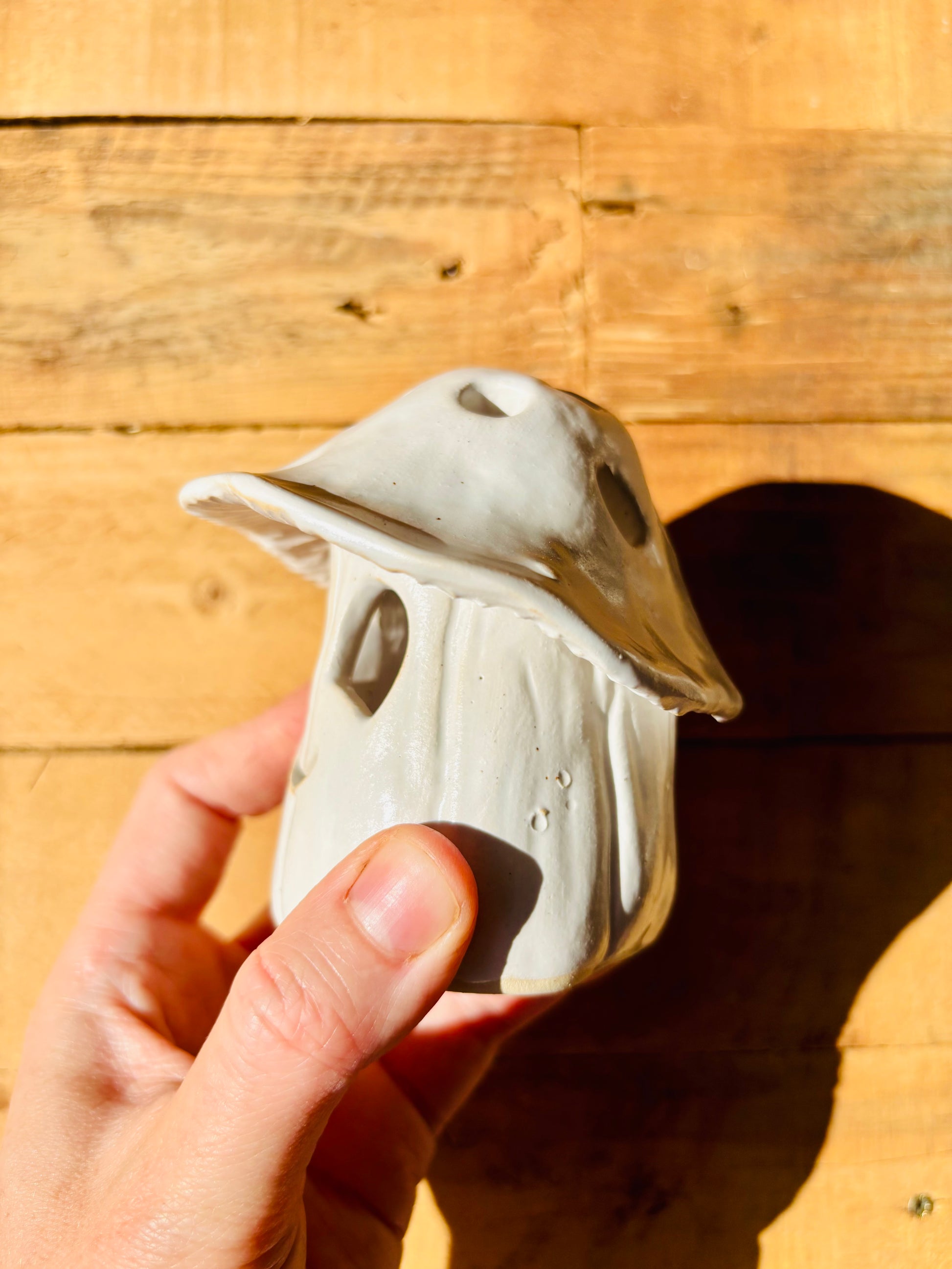 Champignon modelé en grès blanc et recouvert d'un email blanc satiné.