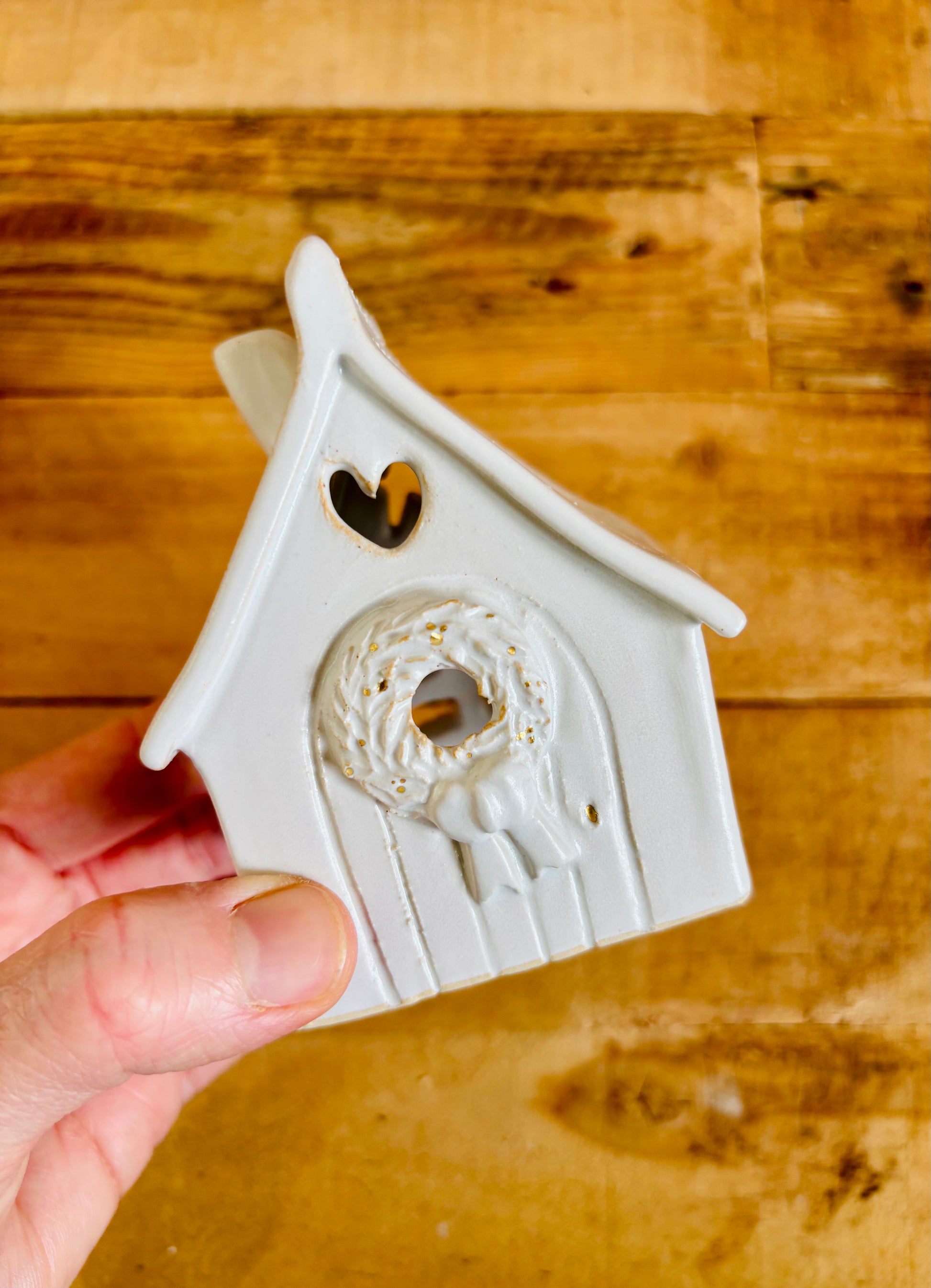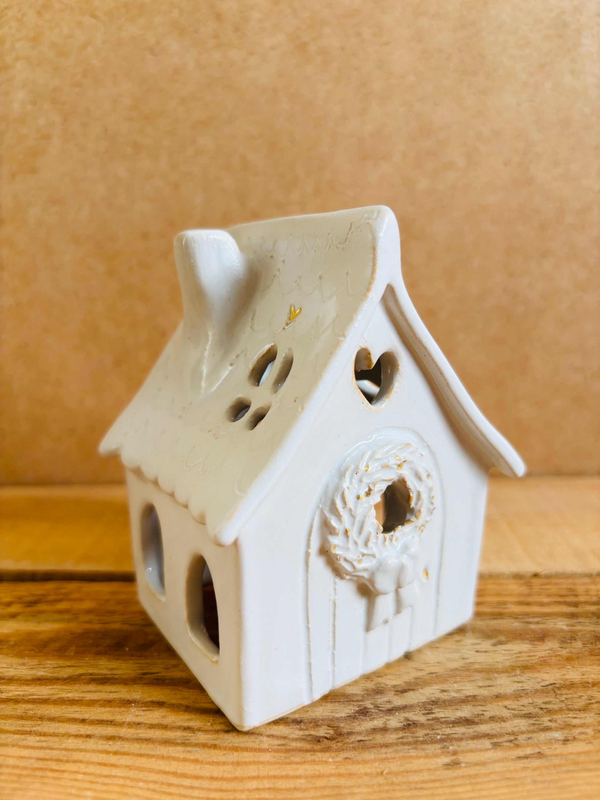 Maison modelée en grès blanc et recouvert d'un email blanc satiné sublimé de petites touches d'or.