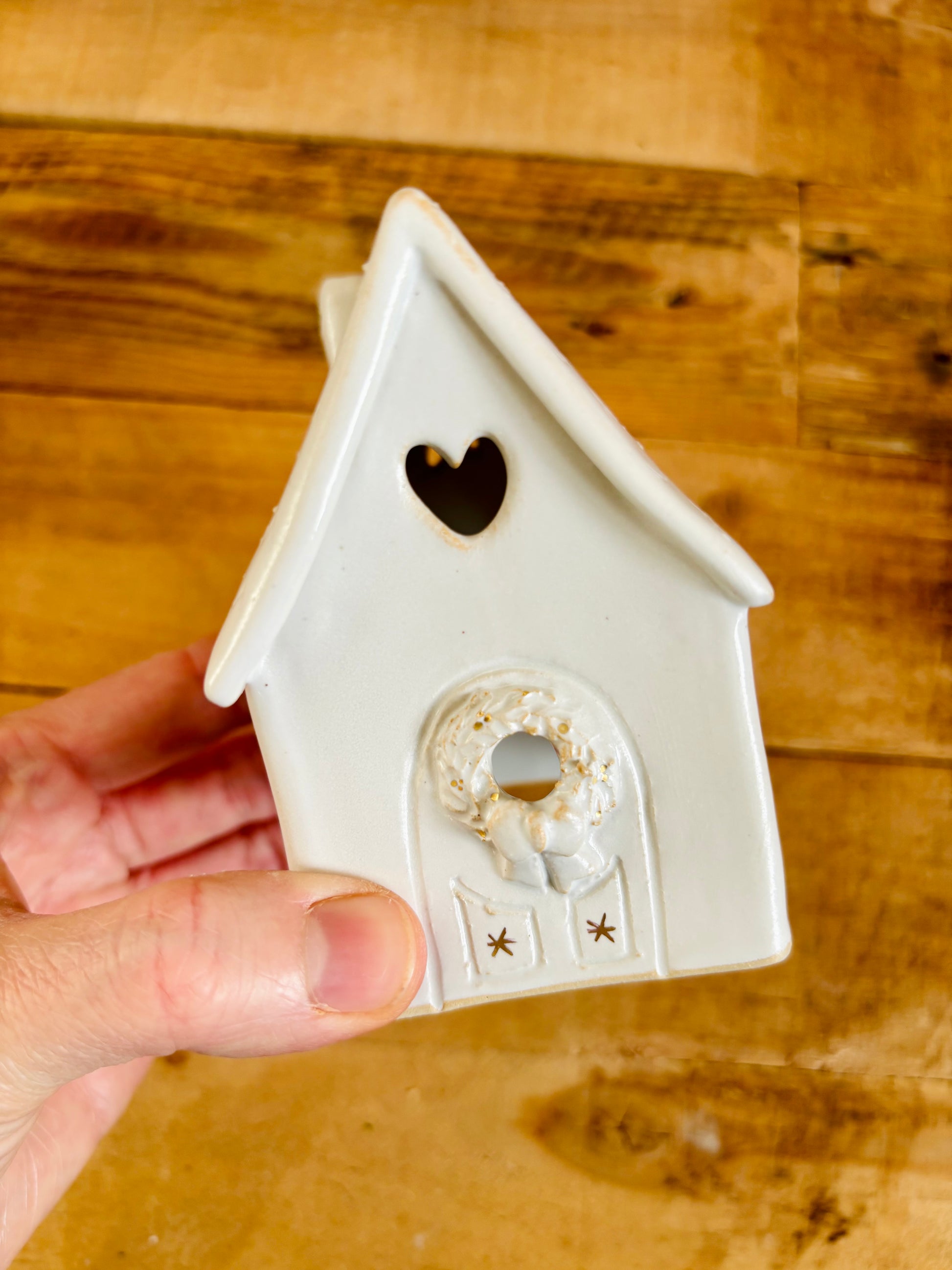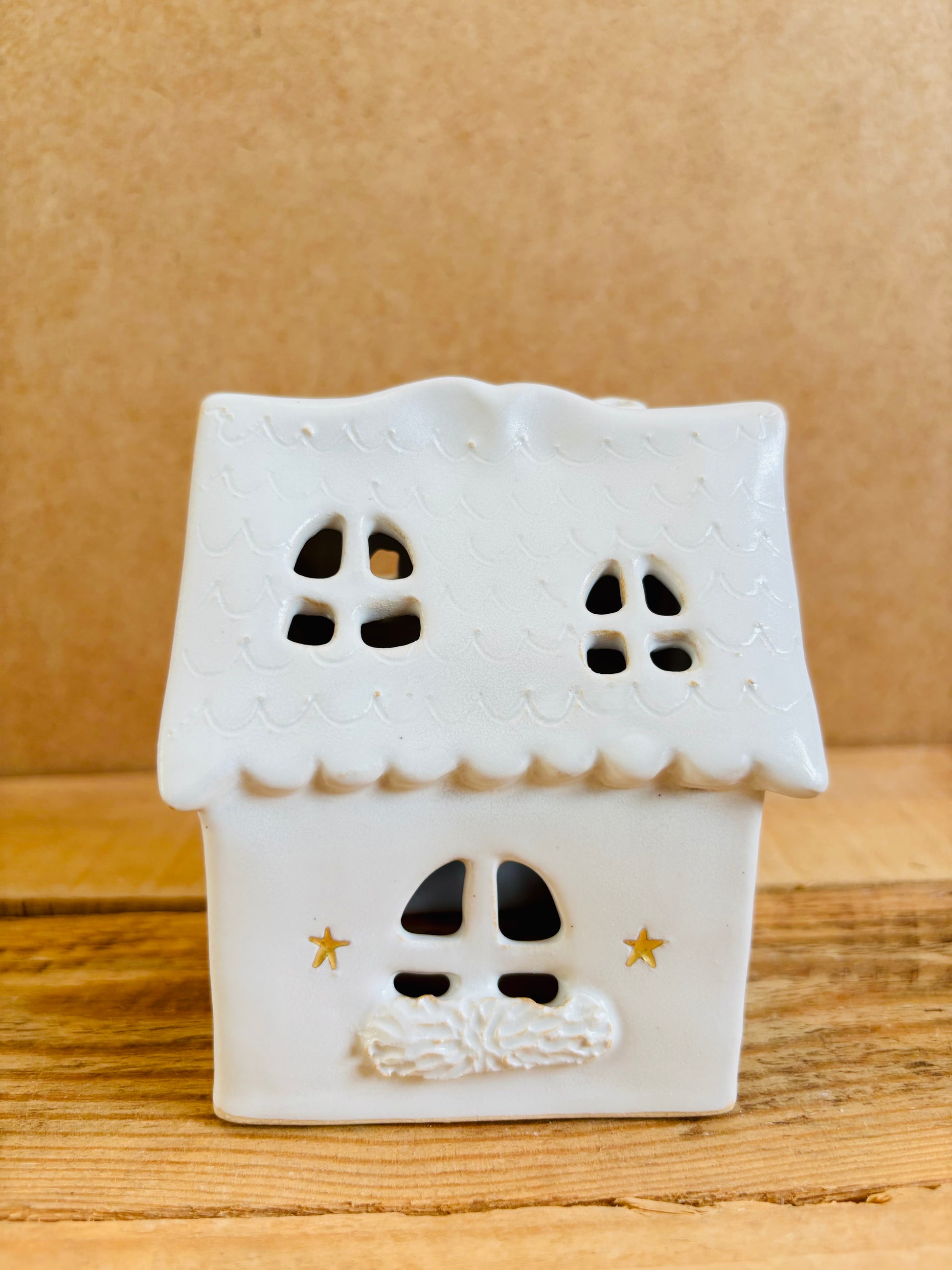 Maison modelée en grès blanc et recouvert d'un email blanc satiné sublimé de petites touches d'or.