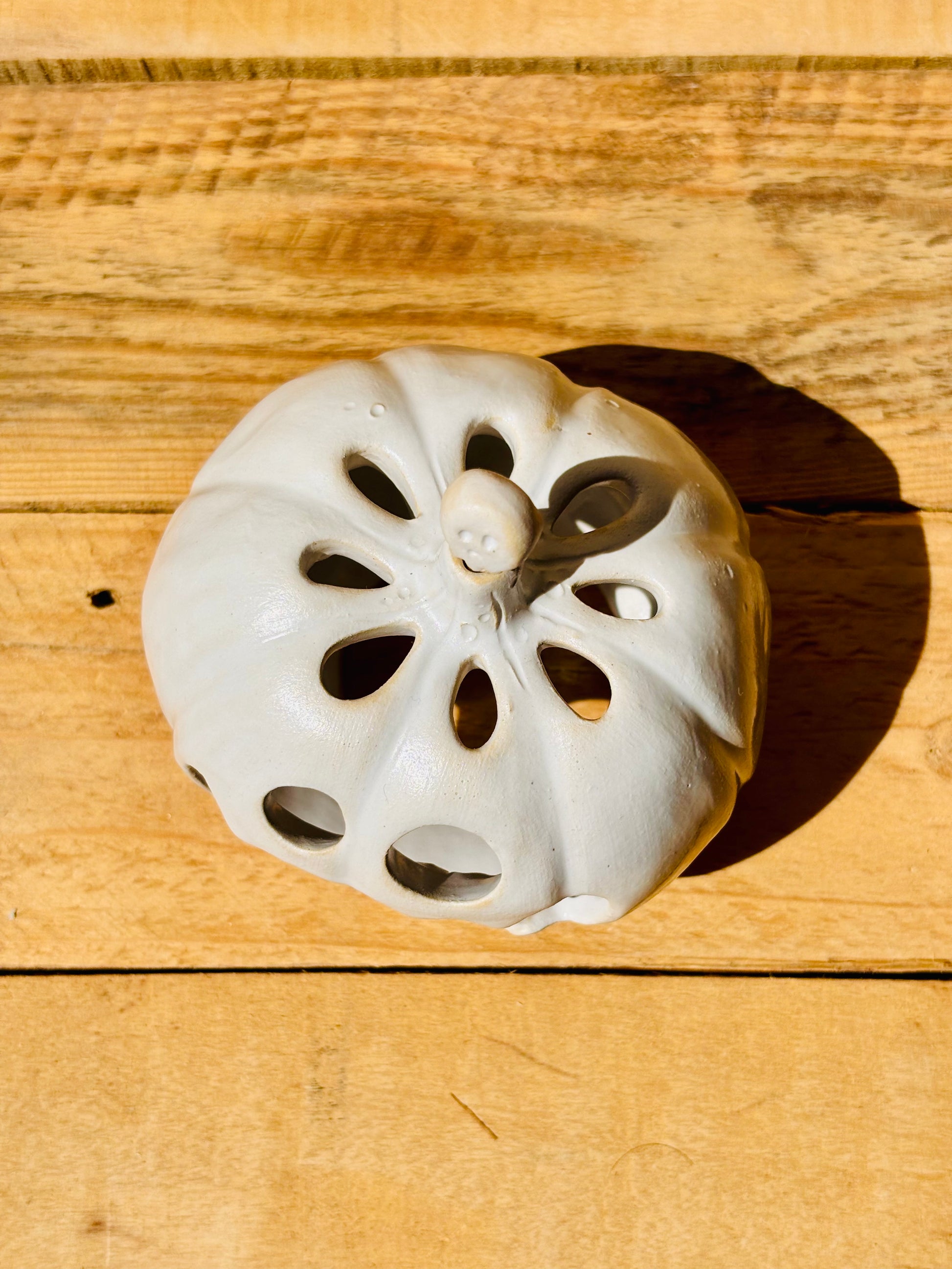 Citrouille modelée en grès blanc et recouvert d'un email blanc satiné.