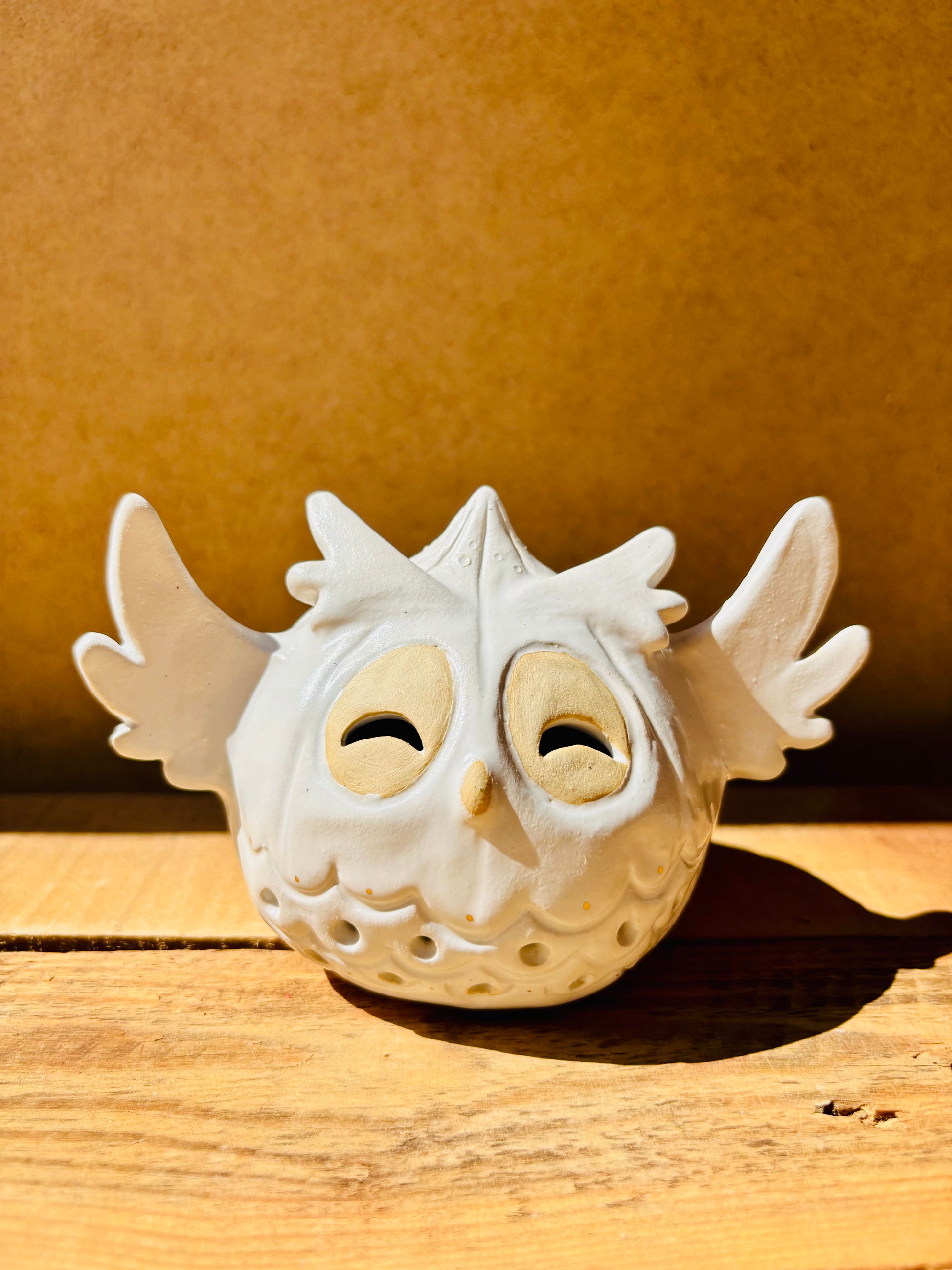 Hibou modelé en grès blanc et recouvert d'un email blanc satiné.