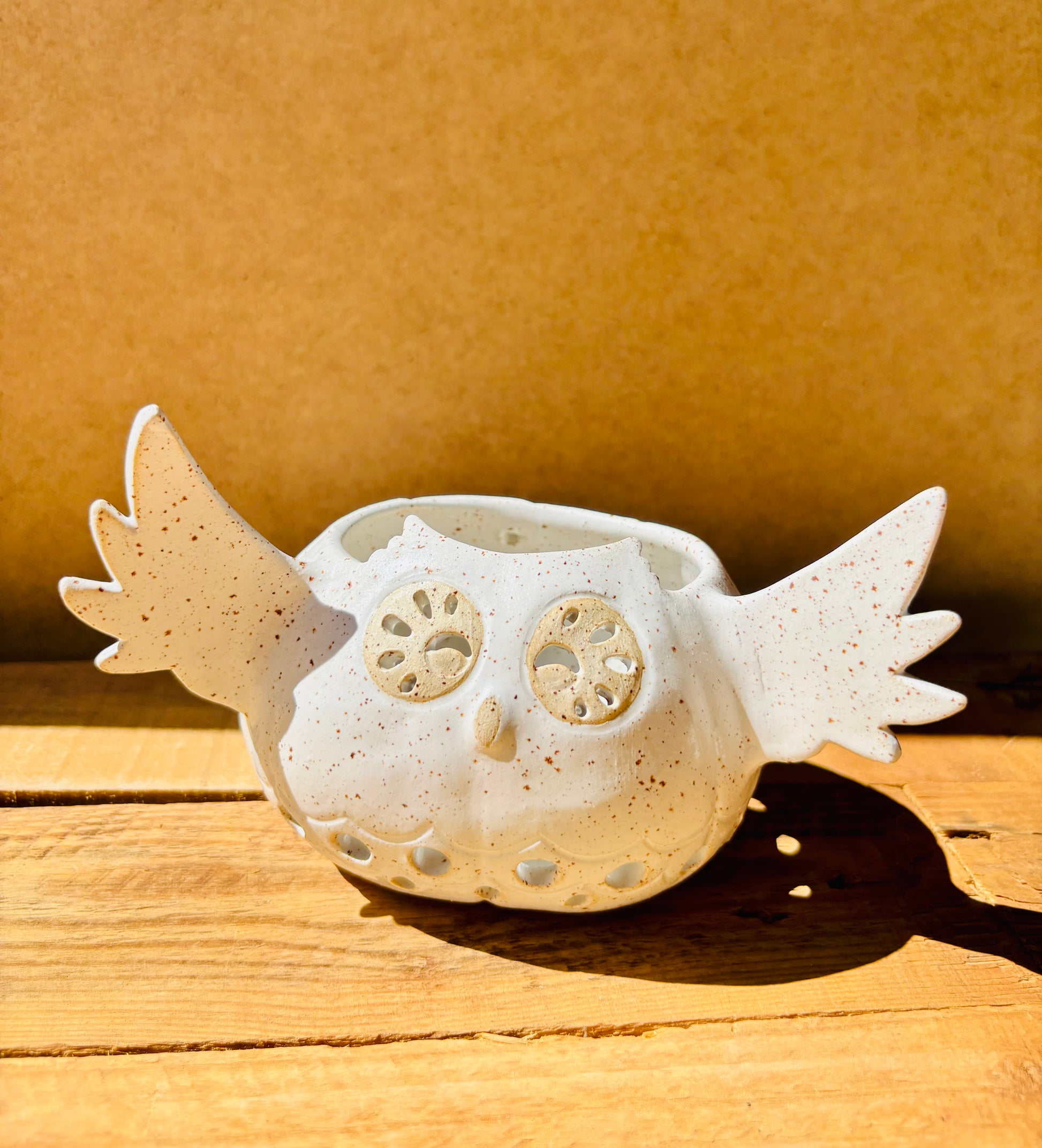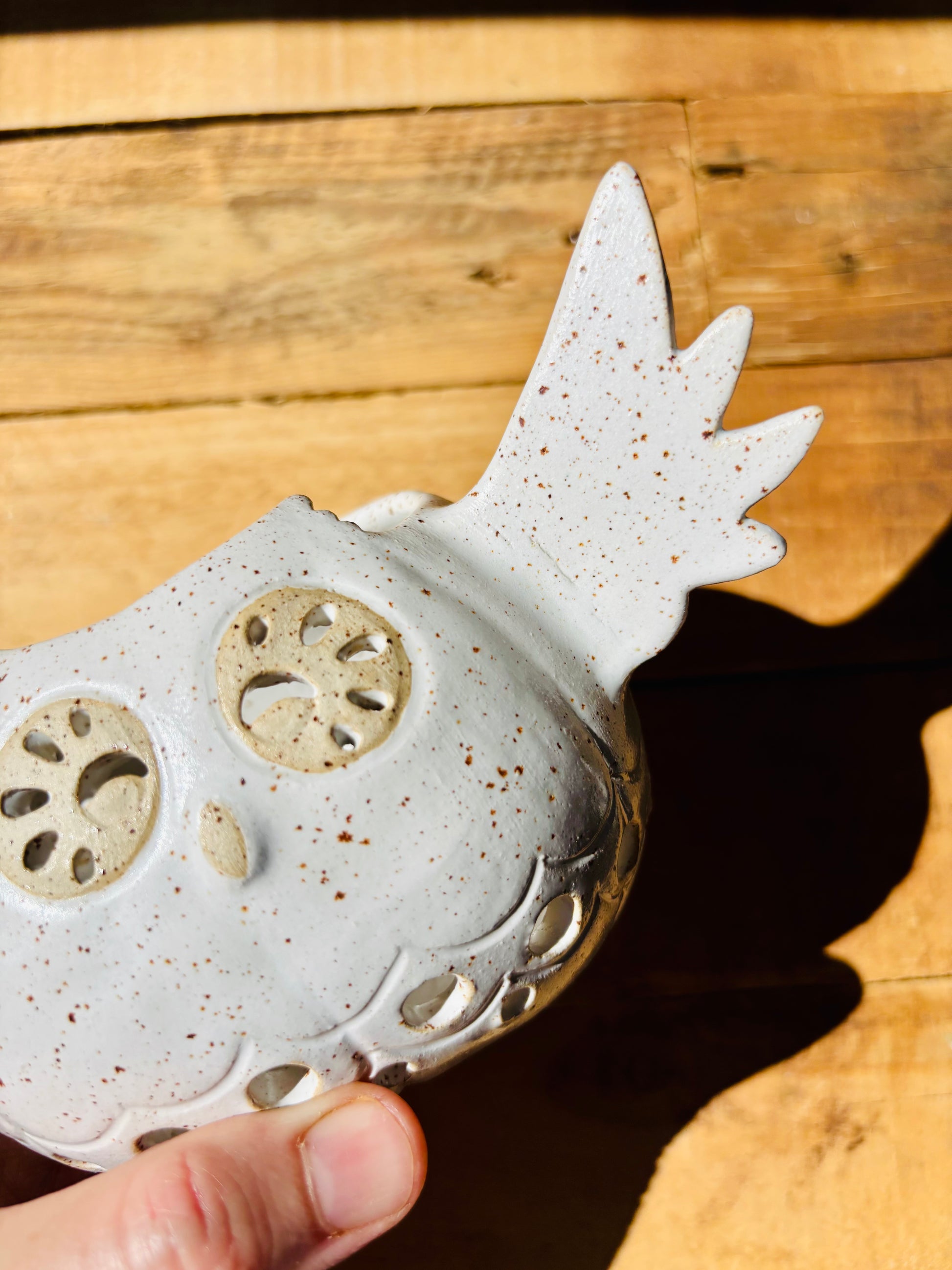 Hibou modelé en grès pyrité et recouvert d'un email blanc satiné.