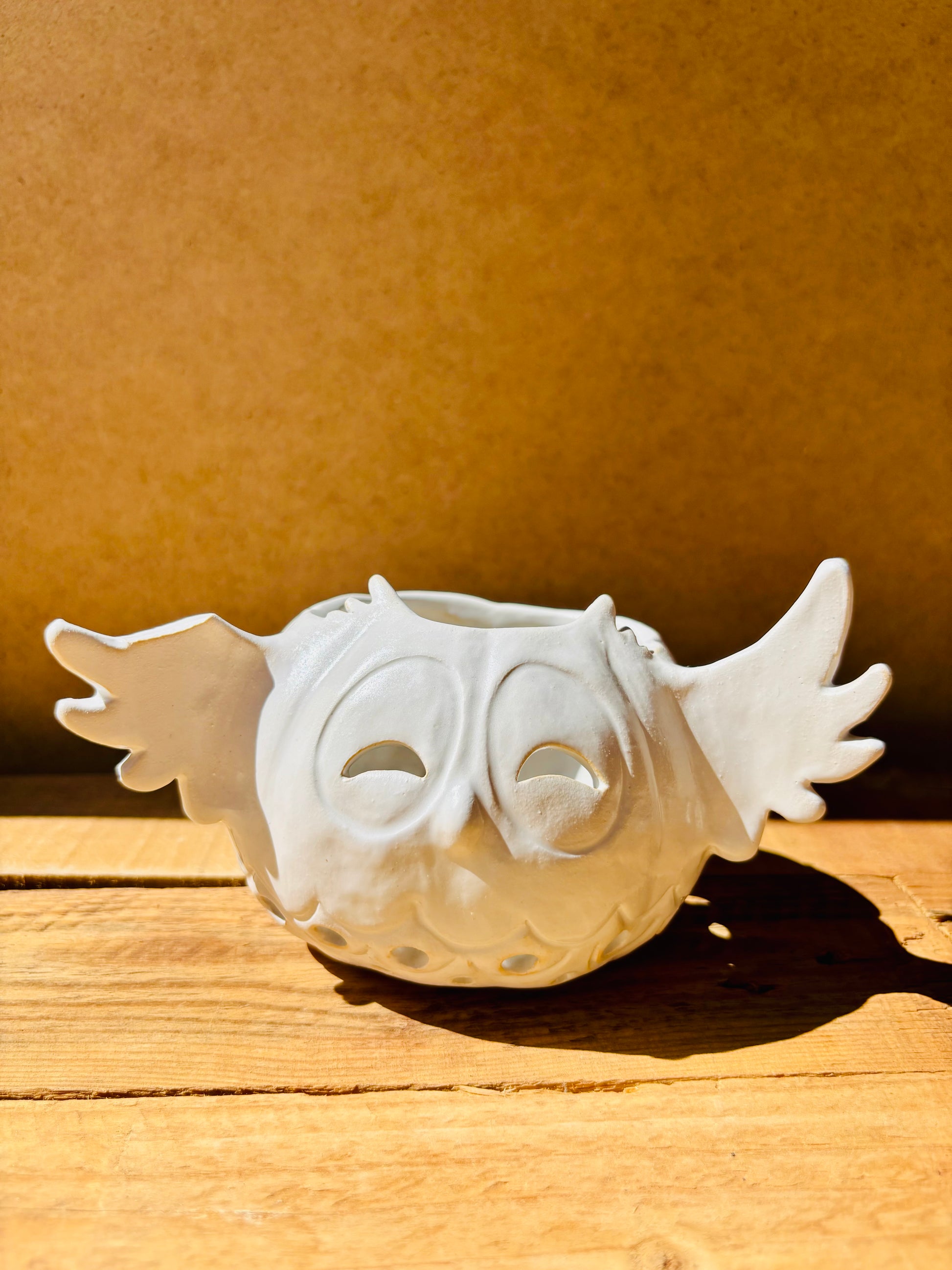 Hibou modelé en grès blanc et recouvert d'un email blanc satiné.