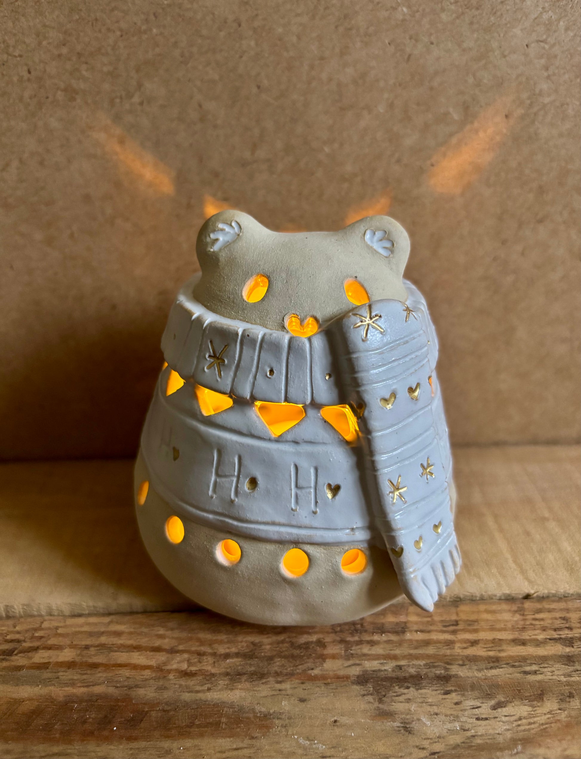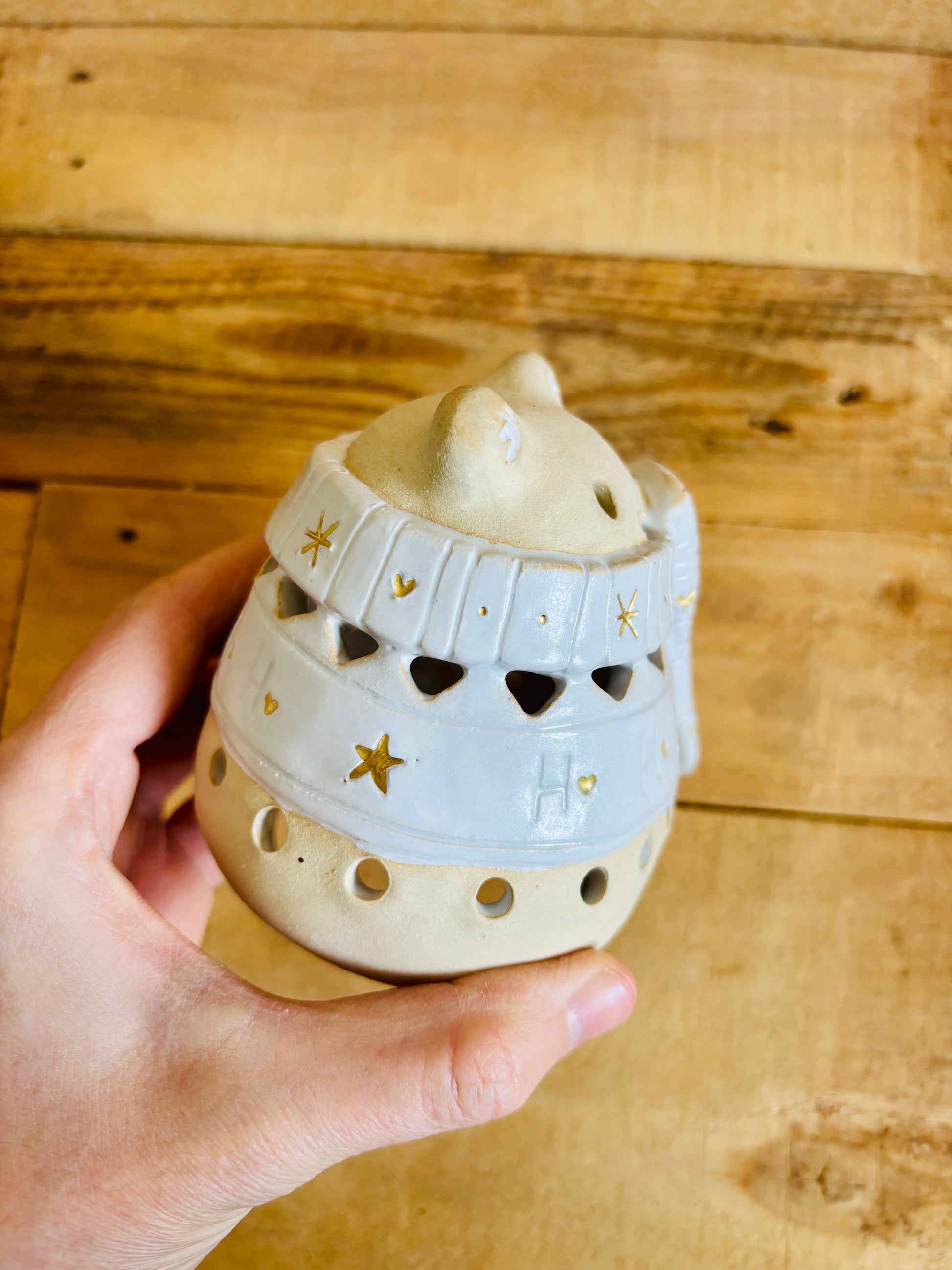 Cet ours s’accompagne d’une bougie chauffe-plat à led avec flamme vacillante (pile incluse).