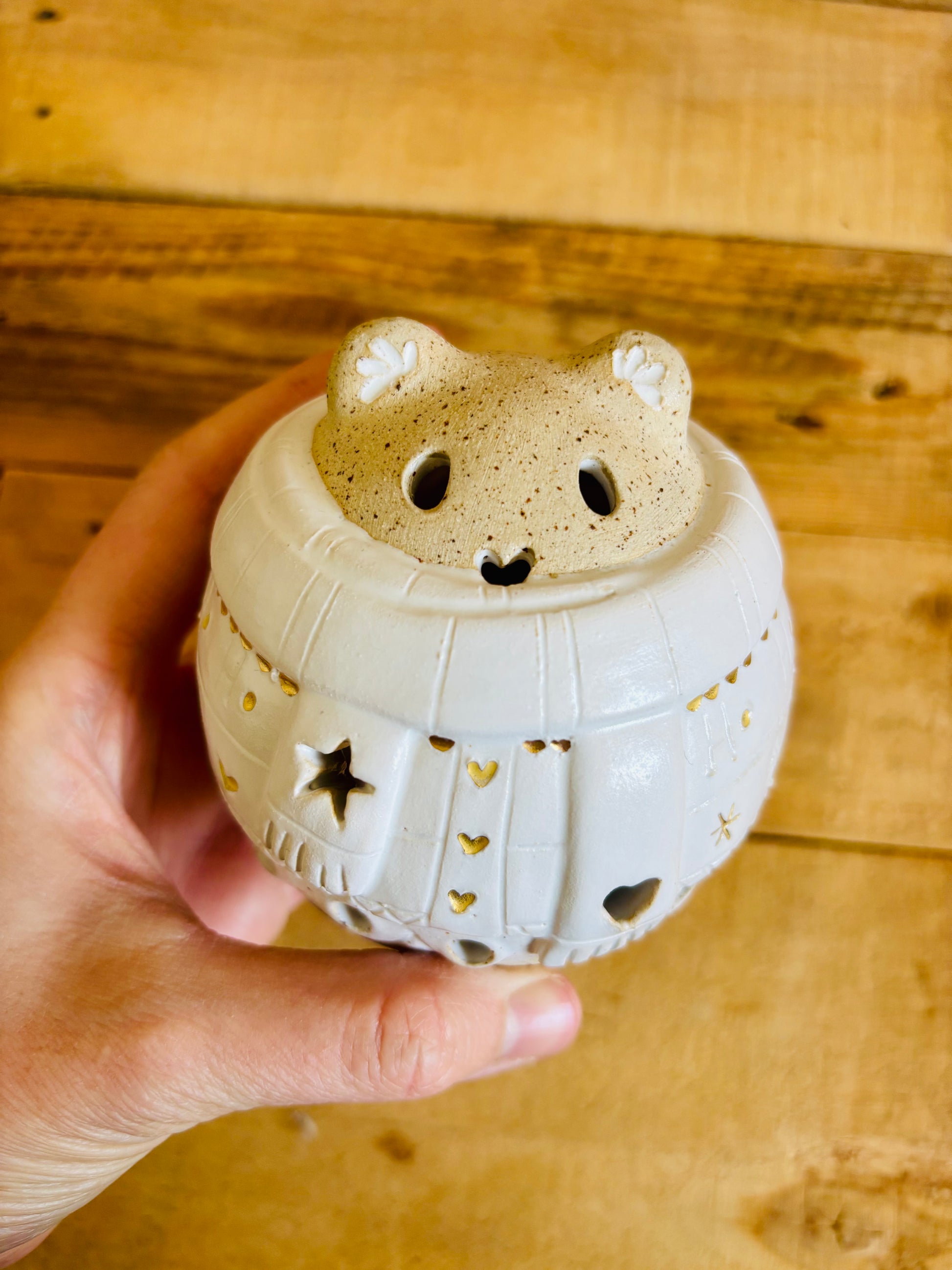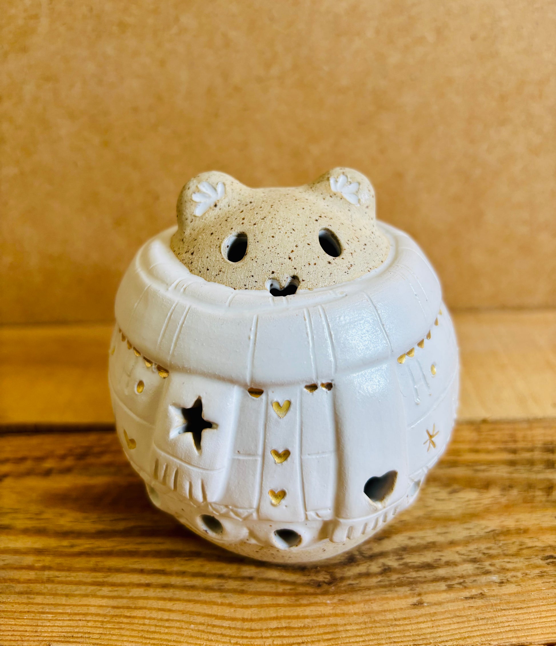 Cet ours s’accompagne d’une bougie chauffe-plat à led avec flamme vacillante (pile incluse).