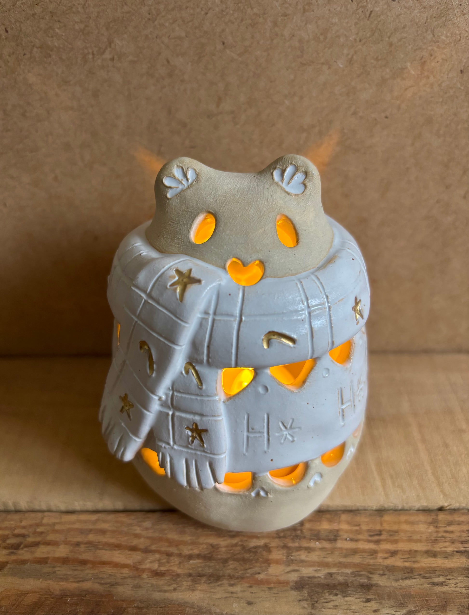 Habillé d'une écharpe et d'un pull de Noël, des motifs ont été peints à l'or.