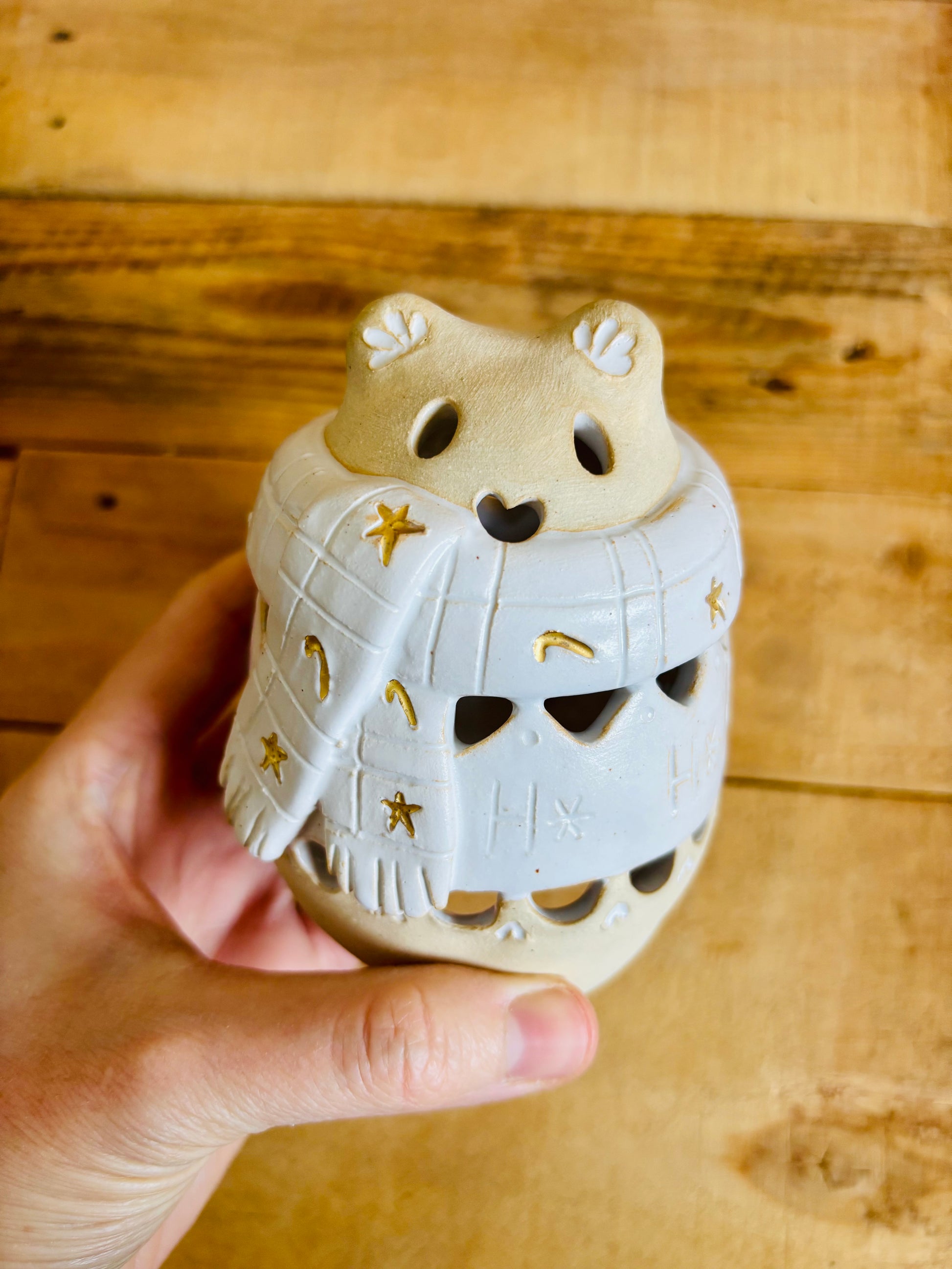 Cet ours s’accompagne d’une bougie chauffe-plat à led avec flamme vacillante (pile incluse).